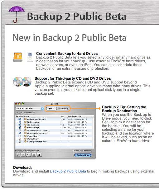 As .Mac users are aware, Apple recently updated the Backup application that comes with .Mac so that it only writes to original, Apple-installed CD and DVD burners.