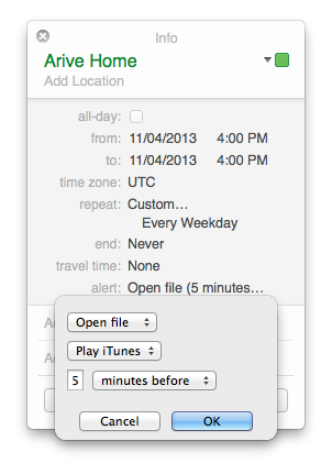 What I would like to do is have iTunes start playing music about 5 minutes before I get home from work, this way when I walk through the door the music is already on. My iMac sleeps while I am work but I would like it to wake up and start playing music.