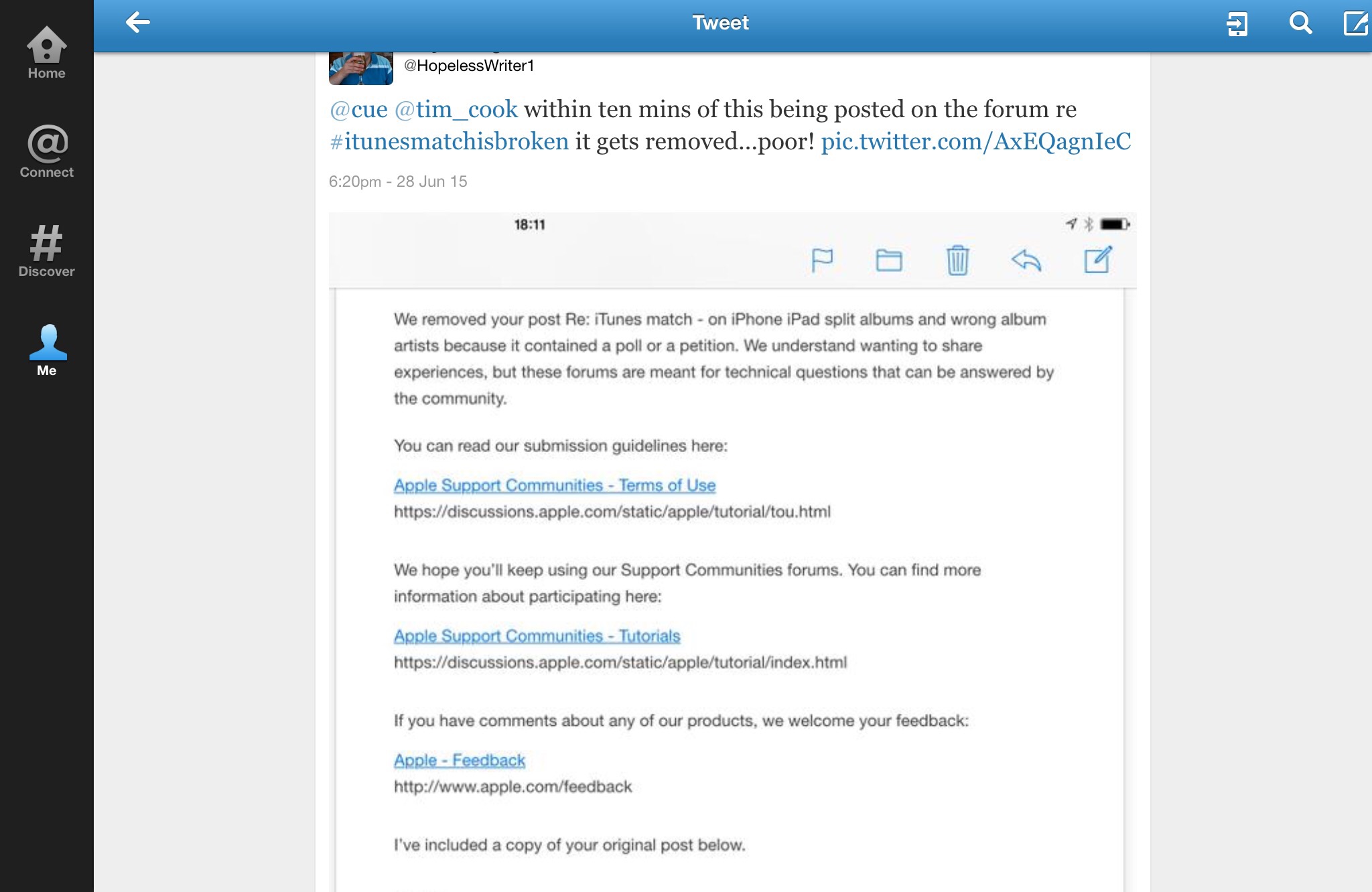 I emailed apple support during that time. I got one response, which was "try rebuilding your library." Of course, I had already tried that, as well as everything else I found on an apple support forums thread, which disappeared a few days later. I was able to reload it from google's cache, but as I mistakenly thought my problem was resolved (and was asked by apple to wipe my phone and laptop) I lost the link in the process. At any rate, it offered a variety of suggestion that a user, who I believe had red#5 in his username, was asked to implement before apple conceding that the problem was on their end. At that point he claimed that apple admitted that there was a problem with his cloud partition and was able to dissociate his account from that, effectively wiping it.