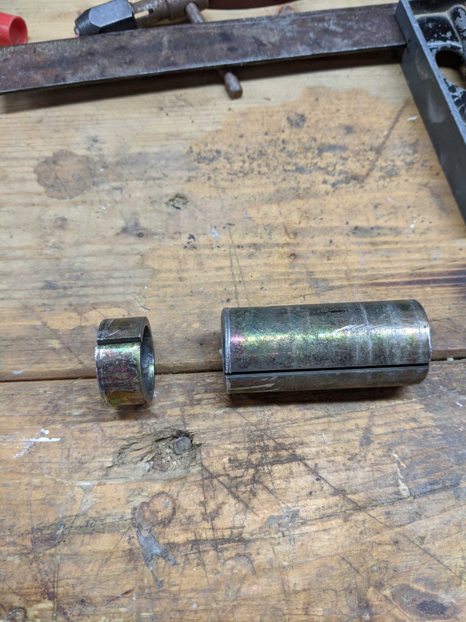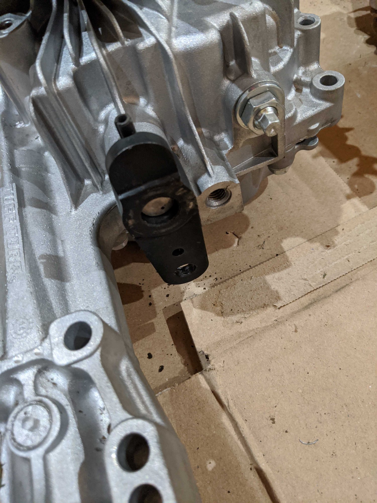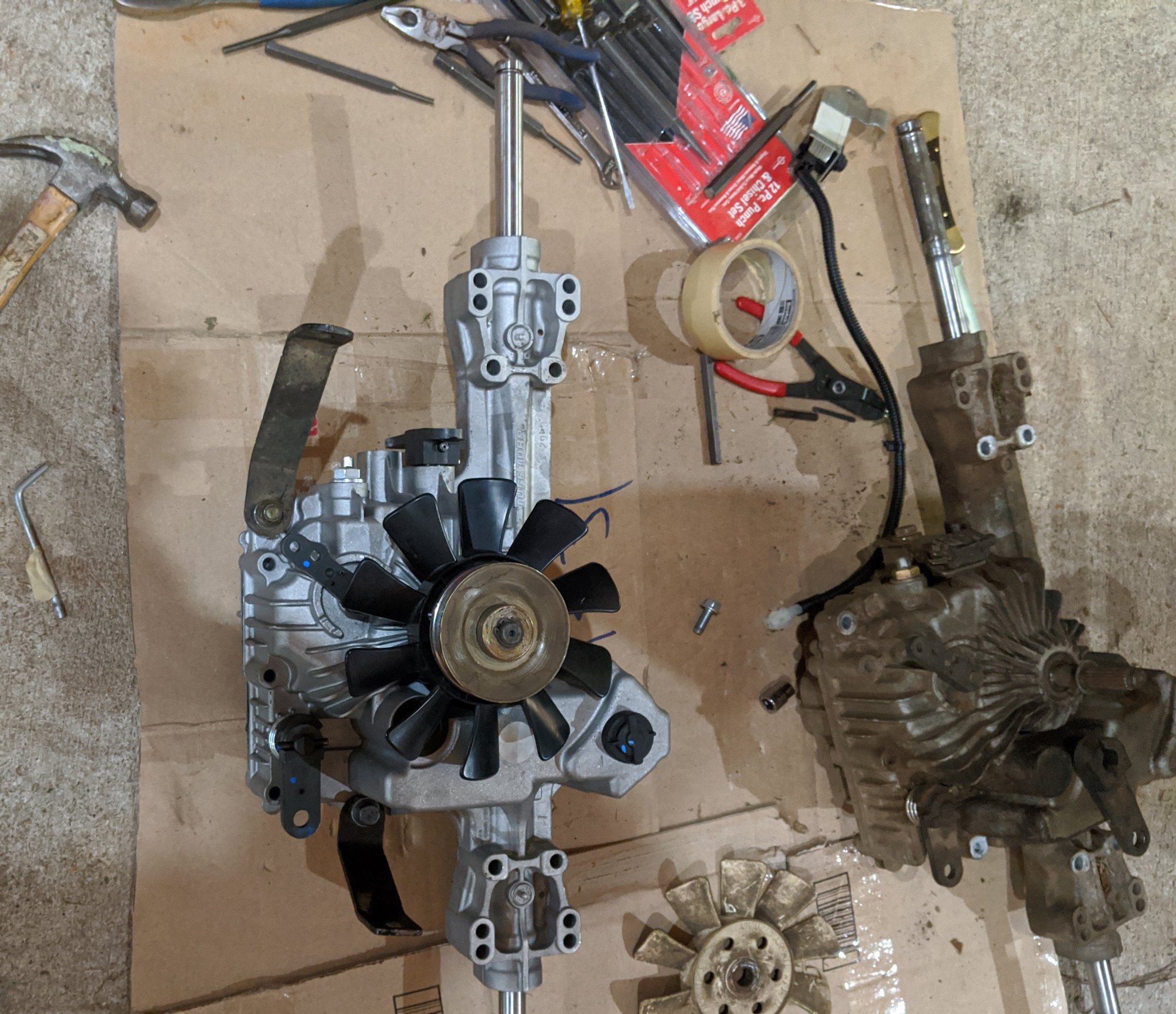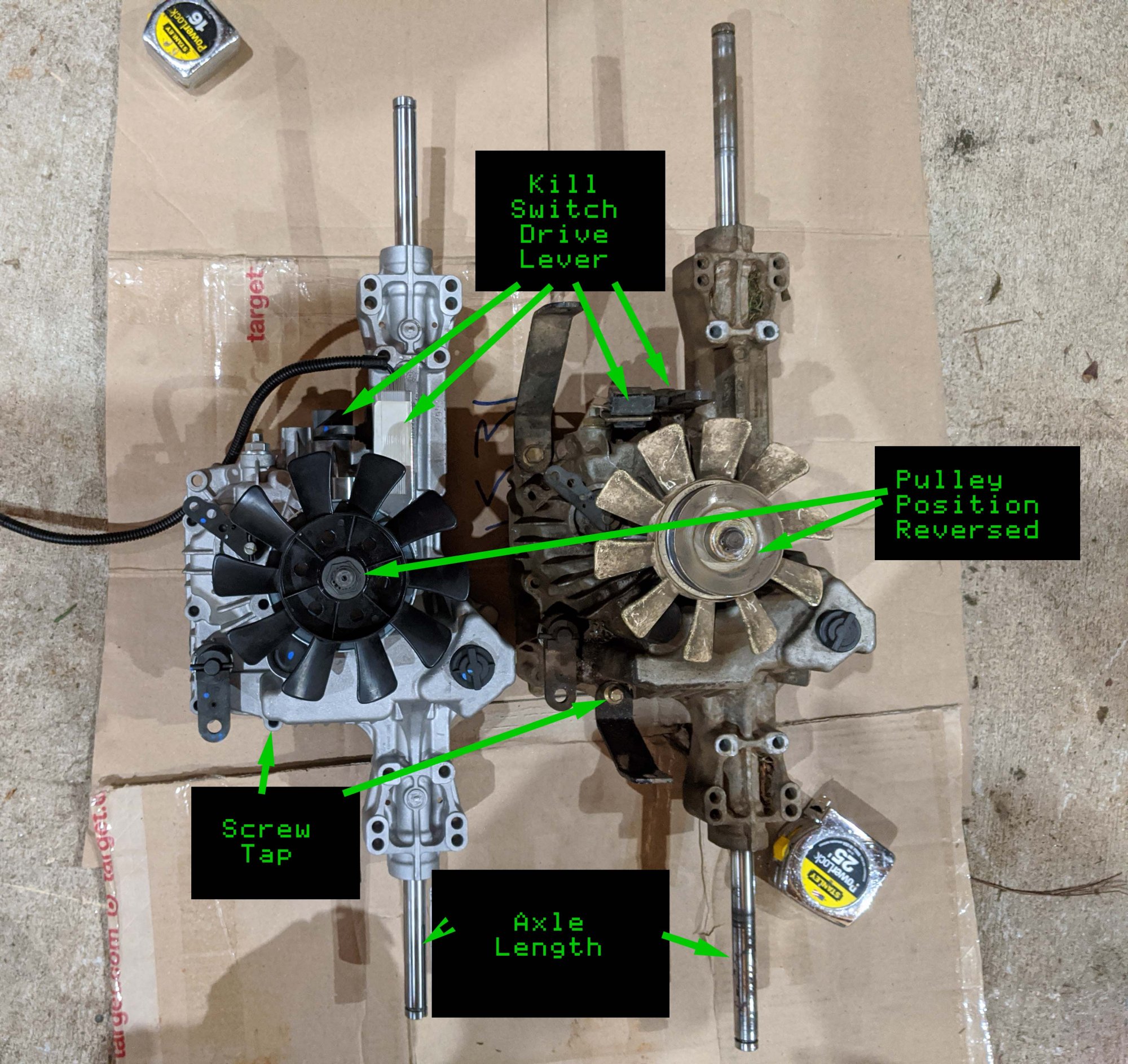 I'm new to the macrumors forum, and wanted to share my story about my lawn tractor transmission too... I just did the K46 (actually a T40J) to K57R upgrade on my JD D110. Thank you velocityg4 for the inspiration! I picked up the K57R from Surplus Center at ~$270 + ~$50 shipping, shipped next day and got here fast and safe. The housings are identical. I opted to crack open the new unit, flip the wedge and replace the axles with my old axles - absolutely no problems there - axle mounts are identical. I also ordered some new axle seals - I highly recommend this since the teeth on the end of the axle mess with the seal/spring when you pull the axle out through them. I took apart more than I probably needed to as I was looking to replace the input drive shaft to avoid belt alignment, but found that I did not need to, since the k57R "stack" includes toothed two bolts as spacers that I can simply slip them on to reorder to match my T40J belt alignment exactly (see pic). These bolts are also great for driving the shaft with a socket on your drill to bleed the air out of the unit when refilling with oil. I tapped the mounting hole as velocityg4 did, and replaced the drive pulley with my original pulley. I also opted to replace the exterior forward/reverse and brake levers with my originals to avoid any pedal issues. I used Permatex UltraBlack for the new gasket and replaced the oil with Mobil1 5w-50. Note the k57R takes a bit less oil than the T40J - probably due to the extra pump hardware in the unit. The hardest/most time consuming parts of the task were scraping all the old gasket off of the housing and getting the roll pins out of the exterior forward/reverse and brake levers.