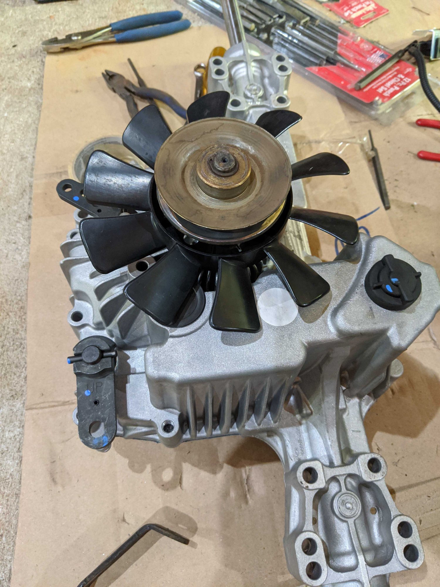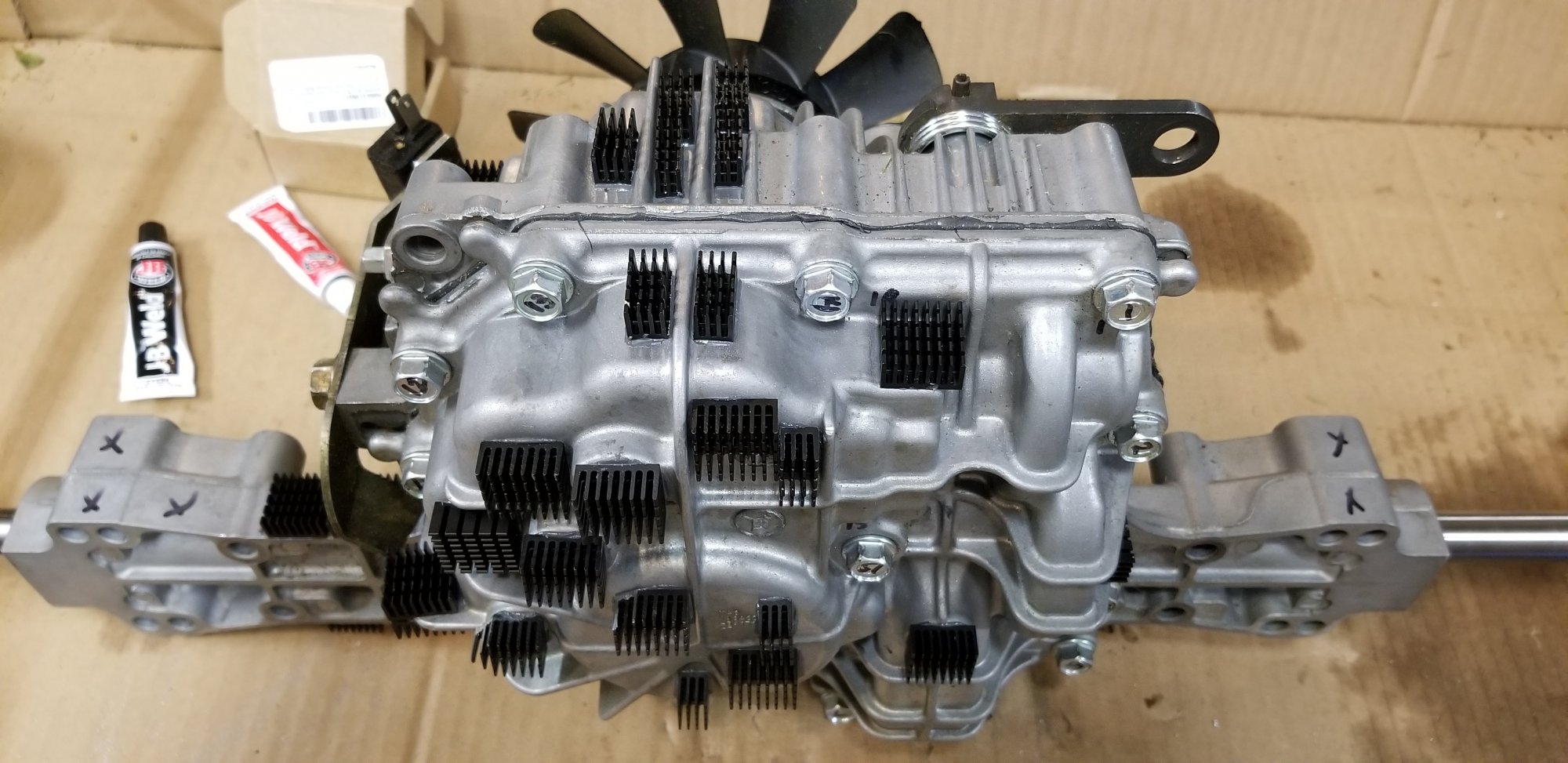 ). I bought a 30 pack of 20x20x10mm heat sinks on Amazon for $9, got some JB weld, and got busy. My placement of the heat sinks was driven by flat spots on the housing, clearance for moving levers/arms and access to housing bolts, proximity to the internal pump, motor and oil sump, and avoiding gravity based pile up of clippings and debris around heat sinks/housing fins, and no up-facing heatsinks that debris will settle into. My first thought was this mod was that even with mounting side and down facing, the heat sinks will be a magnet for grass clippings and debris which could actually insulate instead of dissipate heat. But remember my use case, I'm not going to run into heat issues mowing my flat lawn, it is when I'm working in snow. A long highway speed trailer haul out to the cabin and an once over with some compressed air once a year should get the fins cleaned up for the hard work in the snow. It looks funny, but the math is compelling, ~128 square inches of additional heat dissipating surface area. Still, probably not a mod for everyone.