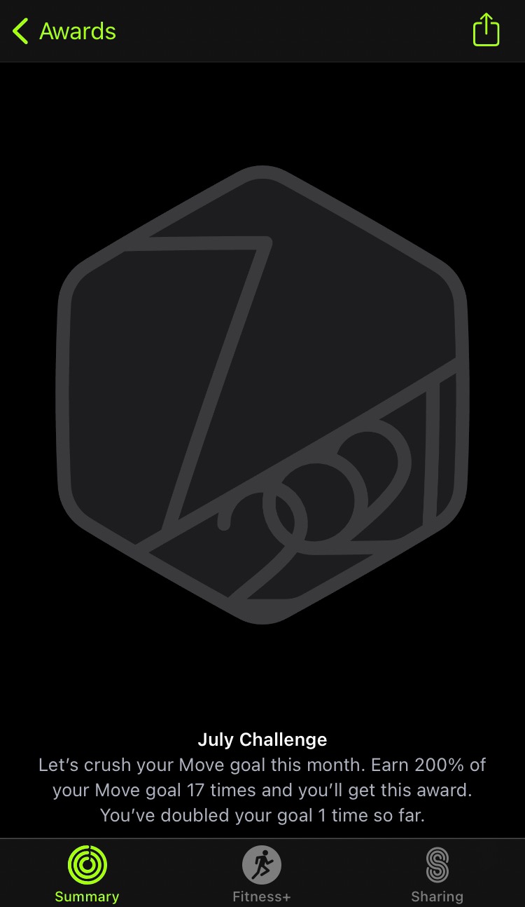 Normally this would be an easy goal for me (Earn 200% of your Move goal 17 times), but I have had too many car days recently (the wife and I went on a trip). I'll see if I can get back on track, but the heat will not help.