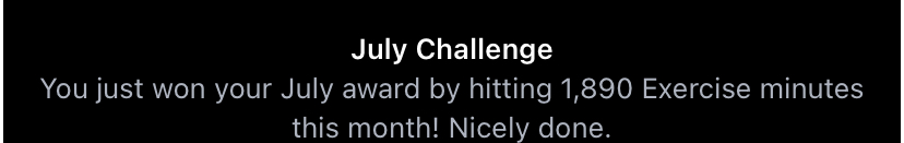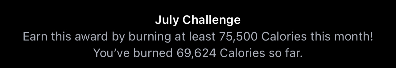 1,530 of 2,800 here so looking good for me to short of sickness or injuryI am at 1062 exercise minutes towards my monthly challenge goal of 1890. On track to getting this monthly challenge.