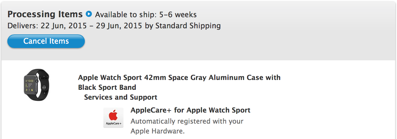 I just checked mine. Now (ordered 42mm SS WSB on 4/13/15) the shipping is like yours June 22-29. I ordered my sport on 4/10/15 and got it on the launch day. This SS, only 3 days apart, won't come till the end of June![]()