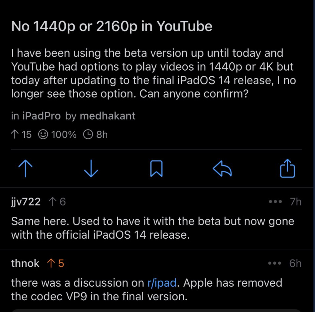4k playback was via iOS/iPadOS YouTube app not using Safari. Of course the 14.2 beta 1 broke that now. Only Safari in Big Sur allows vp9 to do 4K/8K comparing multiple devices.During the betas, I had a 4K option on YouTube via Safari on the iPhone 11. Now, it maxes out at 720p on videos.