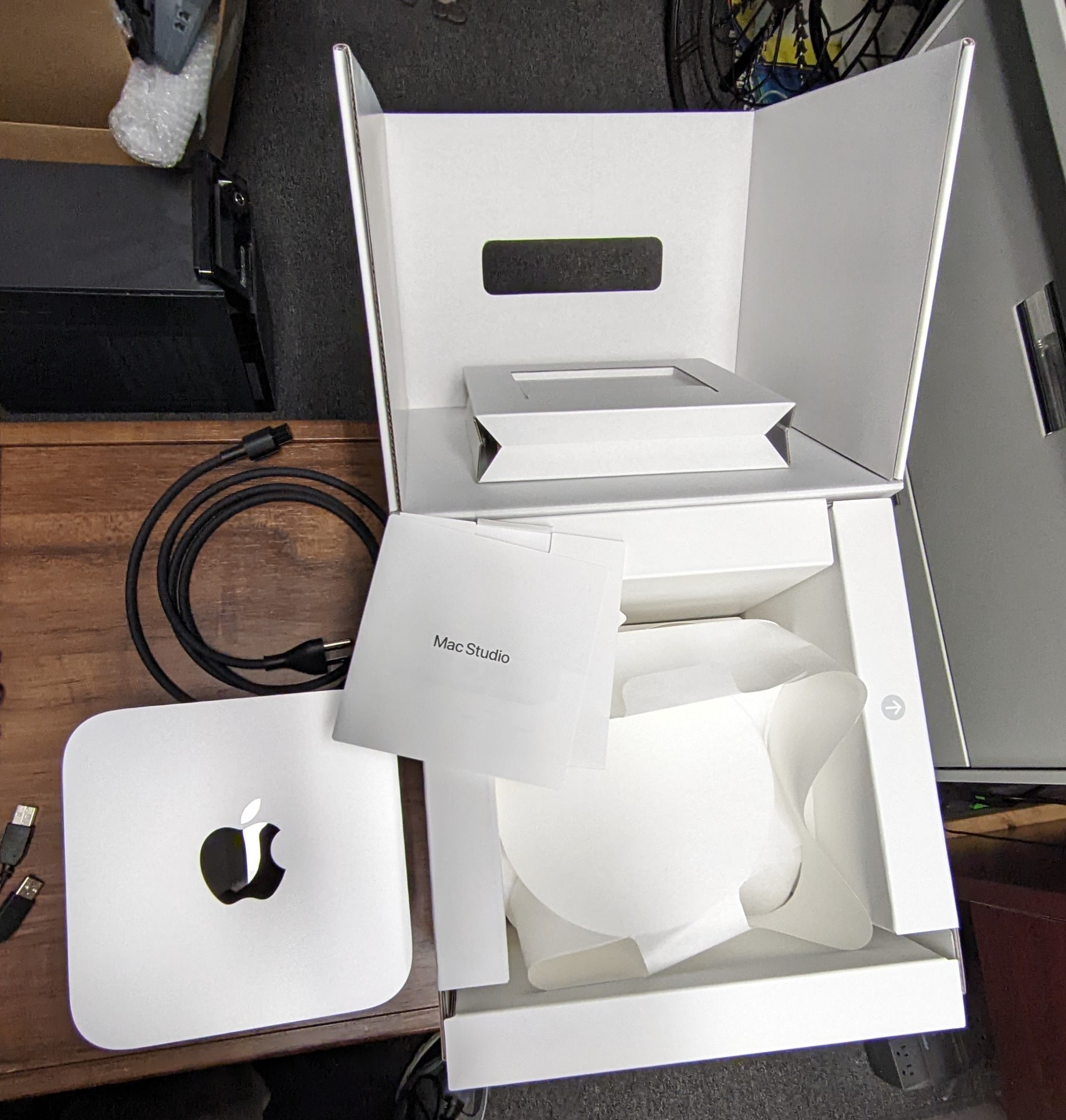 Just got my Mac Studio M2 with 64GB RAM and 2TB SSD - really looking forward to getting this set up! It's so weird having absolutely nothing else in the box but the power cord and docs.