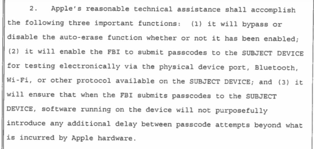 Well, the first court order said that Apple should help unlocking the phone, charge all the cost, and then destroy everything they did to not let it fall into the wrong hands.