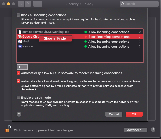 will, despite having the settings in the Security & Privacy preference pane / Firewall settings being set correctly.