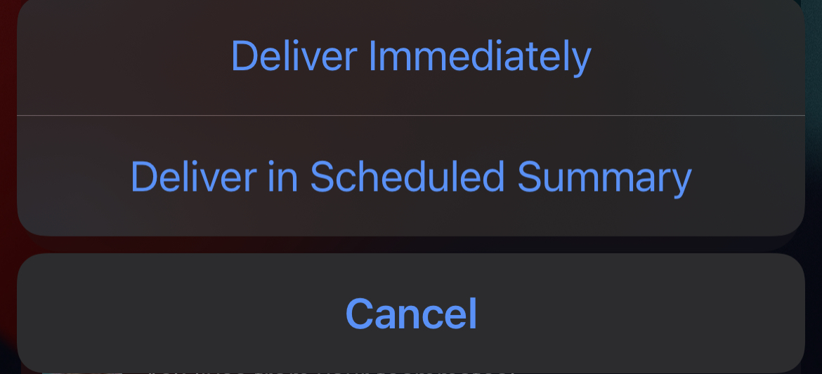 When I hit "Keep..." then "Deliver Immediately", nothing happens to that "Keep receiving notifications from the X app?" notice. It just sits there under whatever notification it popped up under.
