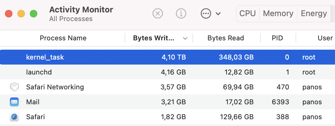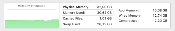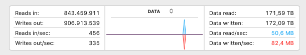I think I will have to disagree when it comes to swap.Sure - Atm. 172 TB written and 171 TB read. As you can see the memory pressure is green, but I can assure you that performance with this amount of swap is not identical to a the same computer running a lower workload with very limited swap. thats why it's useless advice when somebody asks you to check your memory pressure - It doesn't really show how heavy the load on the system is.