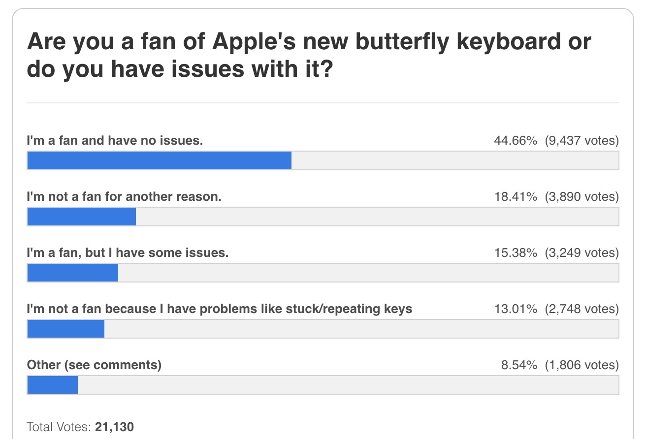So based on your poll, there's combined 46,8% of user doesn't like the butterfly keyboard and/or like it but experience issue. The rest 8.54% user have other reason but clearly don't like it, otherwise they would have said so.