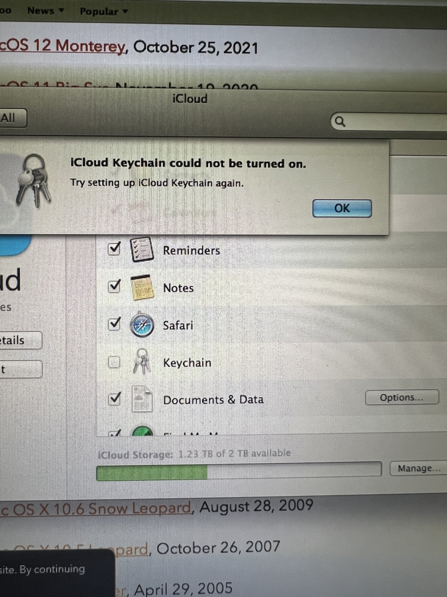 “iCloud Keychain could not be turned on. Try setting up iCloud Keychain again.” (See photo)