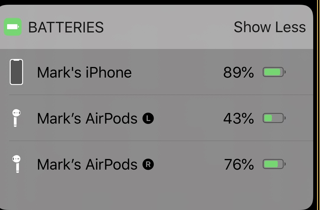 Boy, you're pretty lucky. Here's mine after exactly 1 hour of listening to music. The left AirPod is the original from the end of December 2016. The right is a replacement from October 2017. To say the battery life doesn't degrade is pretty disingenuous considering the claim is up to 5 hours of music listening. As you can see, I can get almost 4 hours out of the right one and not even 2 out of the left one.