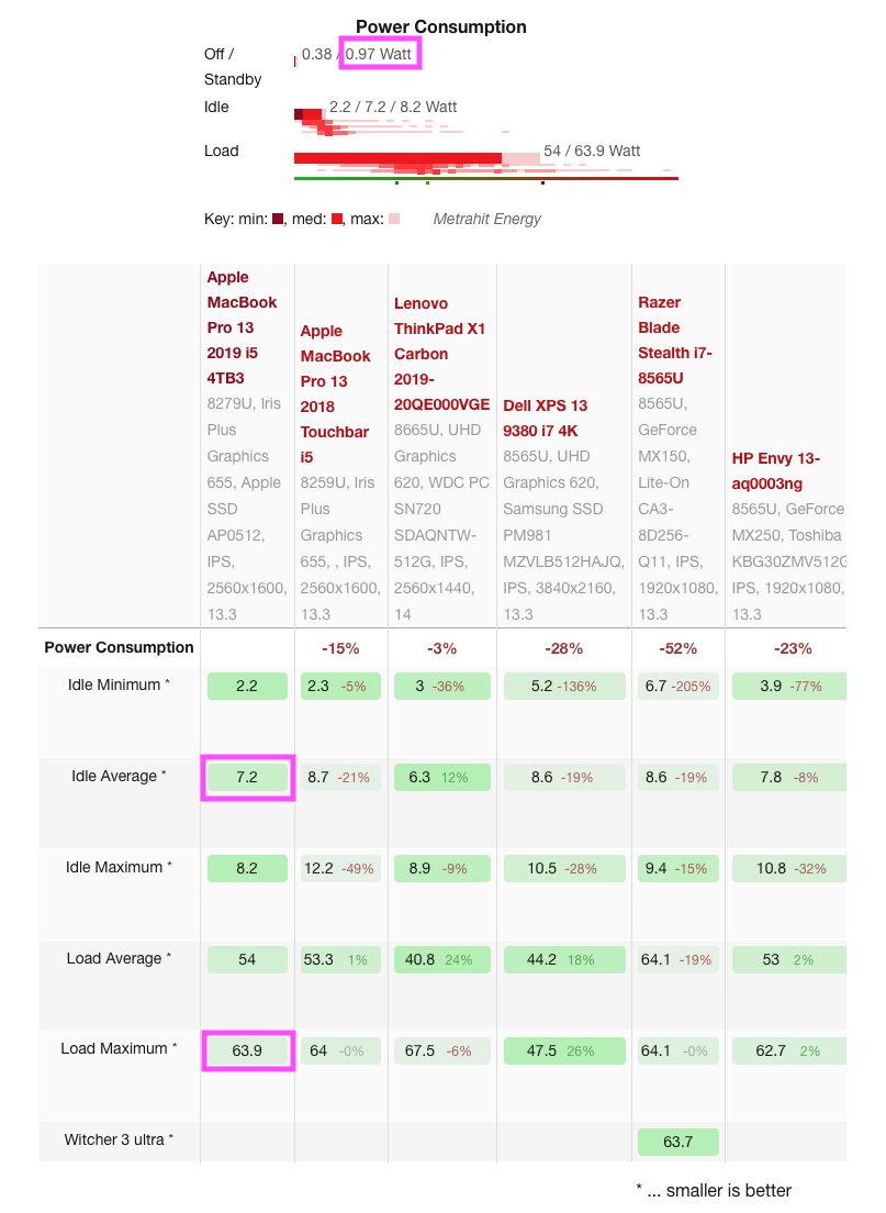 It turns out that the 28W CPU in the MacBook Pro 13-inch (Intel i5-8279U) actually consumes much more than we expected.
