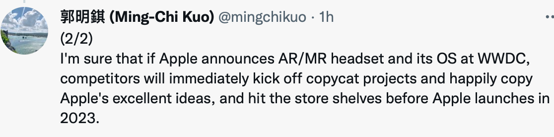 In a pair of tweets on Tuesday, Kuo said he expected Apple's headset to launch in 2023, and that announcing it too early would see Apple's competitors "immediately kick off copycat projects" and release rival products before Apple's headset hits the shelves.