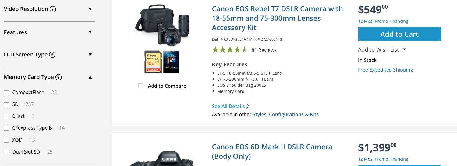 I was wrong, cameras with SD cards make up more than 90% of the market. Here are mirrorless, DSLR and point and shoot cameras being sold by card type straight from B&H. Left hand side of each photo. As Ive said multiple times, SD is the industry standard. Next.The Canon EOS R was for building up your RF glass on until the R5. The 5DIV has CF as the primary card and a SD for backup that significantly reduces the cameras performance. The 1DxII uses CFast 2.0 and CF as the backup card. The Nikon D850 has XQD as the main card that has now been firmware upgraded to accept CF Express. The Sony A9ii has just been replaced with the A1 which is dual CF Express type A to finally fix the buffering issues a lockup’s caused by them using SD cards in a pro camera.