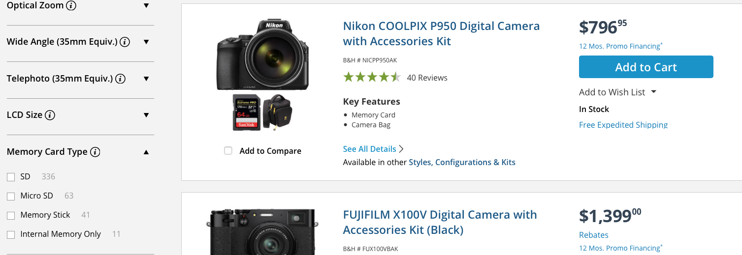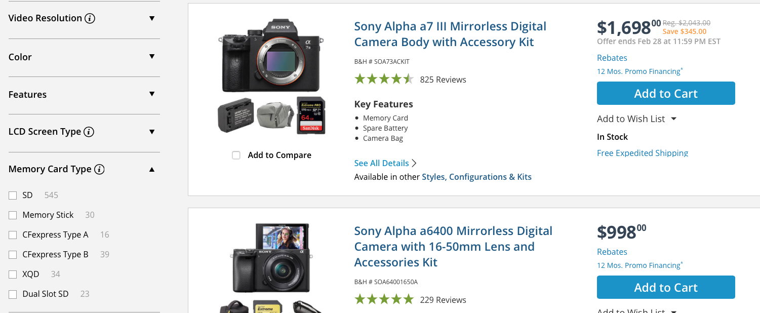 I was wrong, cameras with SD cards make up more than 90% of the market. Here are mirrorless, DSLR and point and shoot cameras being sold by card type straight from B&H. Left hand side of each photo. As Ive said multiple times, SD is the industry standard. Next.