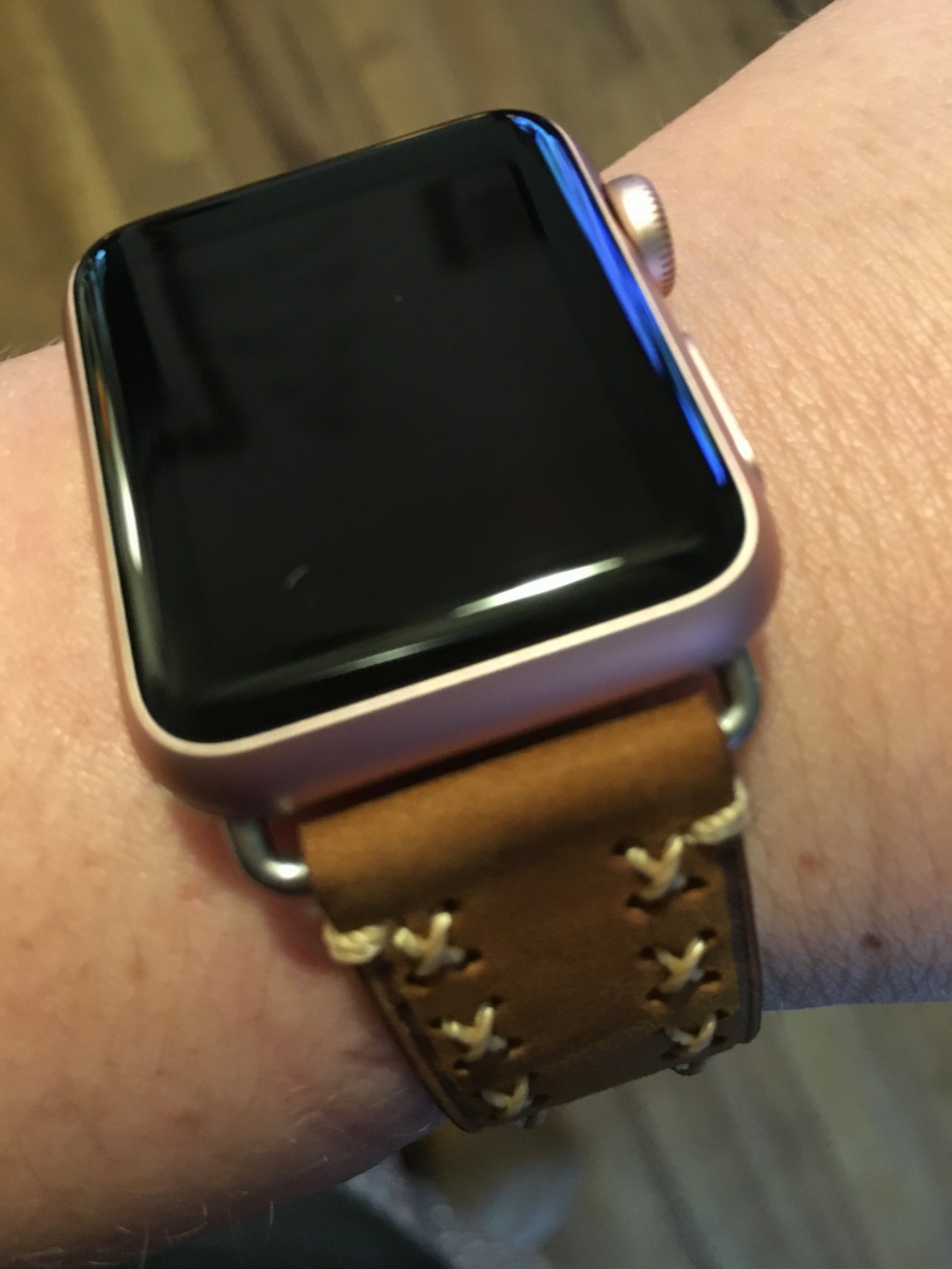 3. Casemate edged leather band in tan/blue (http://www.amazon.com/Case-Mate-Smartwatch-Replacement-Apple-Watch/dp/B00YY4X8HU/ref=sr_1_10?ie=UTF8&qid=1450809771&sr=8-10&keywords=casemate+apple+watch): Got an open-box version from Amazon for $35. Absolutely love the colors on this. Same thickness/puckering issues as the white/pink model. The sizing felt a little awkward on this one...whereas with the white/pink strap I was comfortably on the second to last hole, that hole was WAY too loose in this color and the third-to-last hole was just slightly tight. Hopefully with breaking in this will resolve.