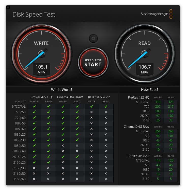 FWIW The 100MB/s Disk Speed test I posted was on a freshly erased partition. The more recent, much slower, Disk Speed test that I posted was on the same partition but after I've been using it as a video scratch disk.