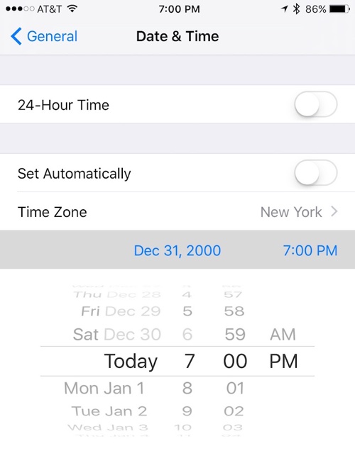 With iOS 9.3 beta 4, the date on the iPhone or iPad can't be set beyond December 31, 2000 at 7:00 p.m. ET, which equates to 1/1/01 at 12:00 a.m. GMT. That effectively puts an end to the 1970 bug, which was used to trick some people into bricking their devices.