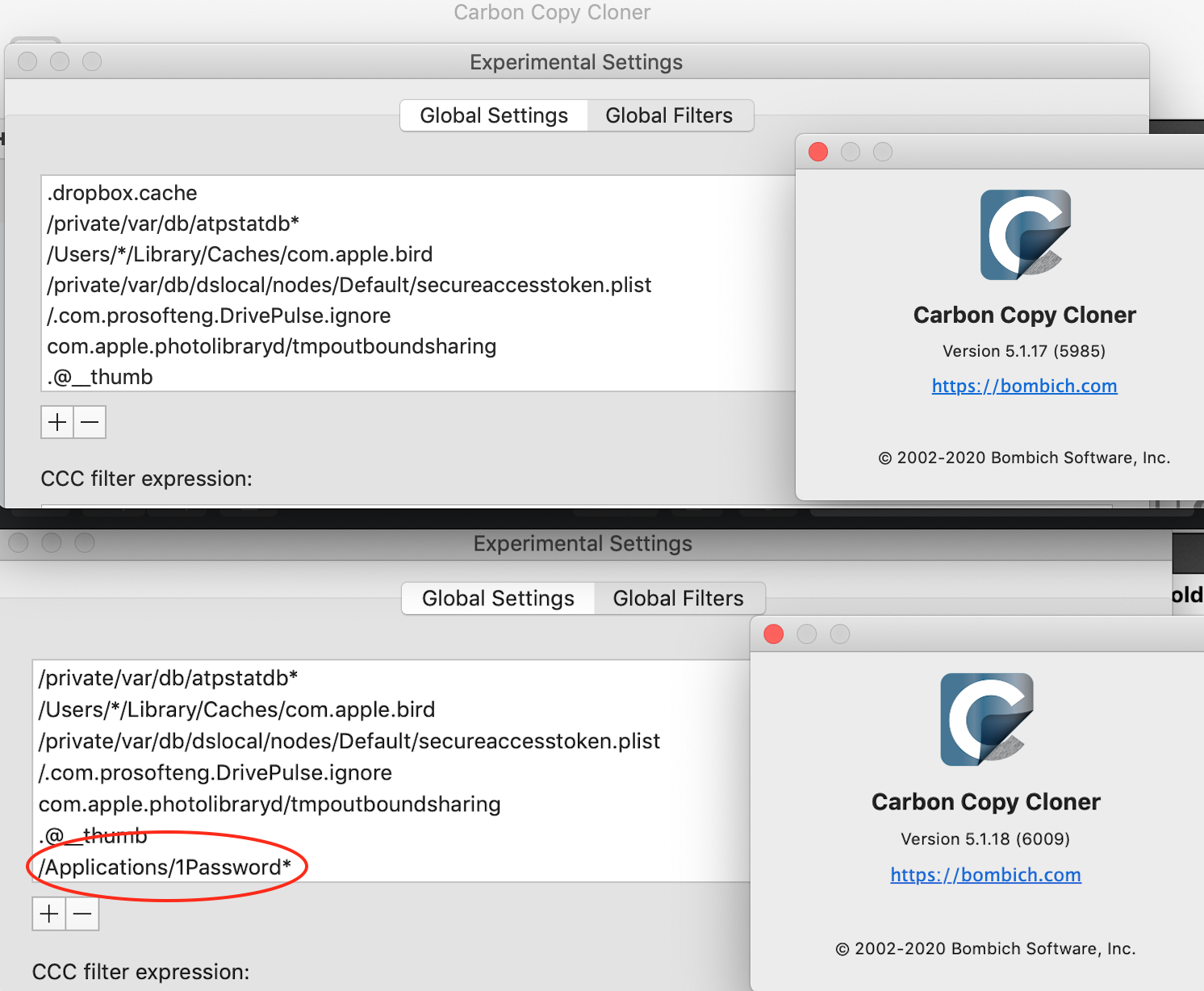 The new version (5.1.18) of CCC deliberately excludes 1Password at the recommendation of Agilebits, 1Password developer.
