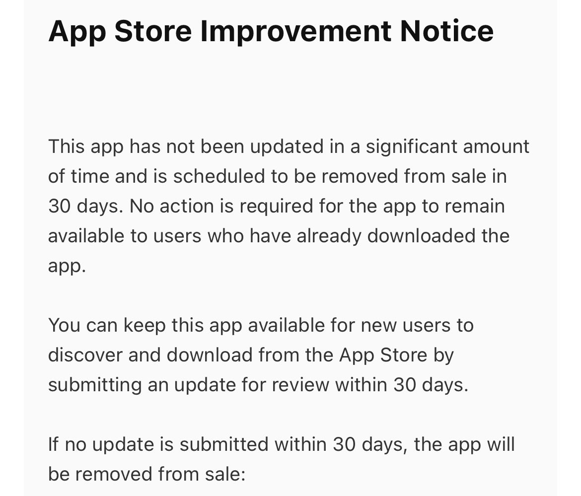 So the Dev choose to leave the older legacy App till its certificate expires in AppStore to not instantly upset users of older iDevices, and sometime later this Apple „Dev friendly reminder“ arrives by email into the Devs inbox.