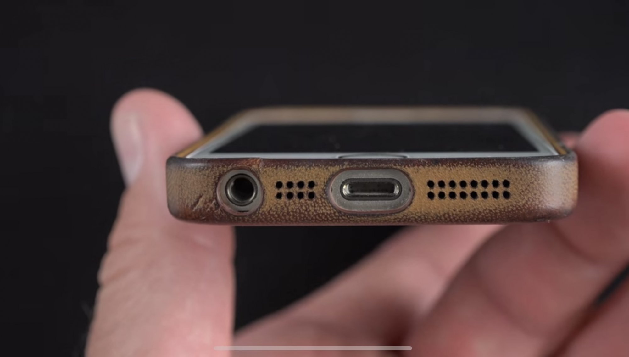 This means that the open bottom has more protection from drops, and when resting on a charging dock. The steel frame floats a millimeter above the charging dock, resting instead on the leather lip.