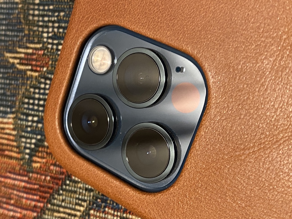 The camera cutout is bare leather. I'd previously observed that the plastic edging on the Apple case won't change color as the leather ages, but I've also gotten a few big dings & scrapes in mine—so now it's not ripped-and-scuffed leather, which looks good, but stupid chewed-up plastic.