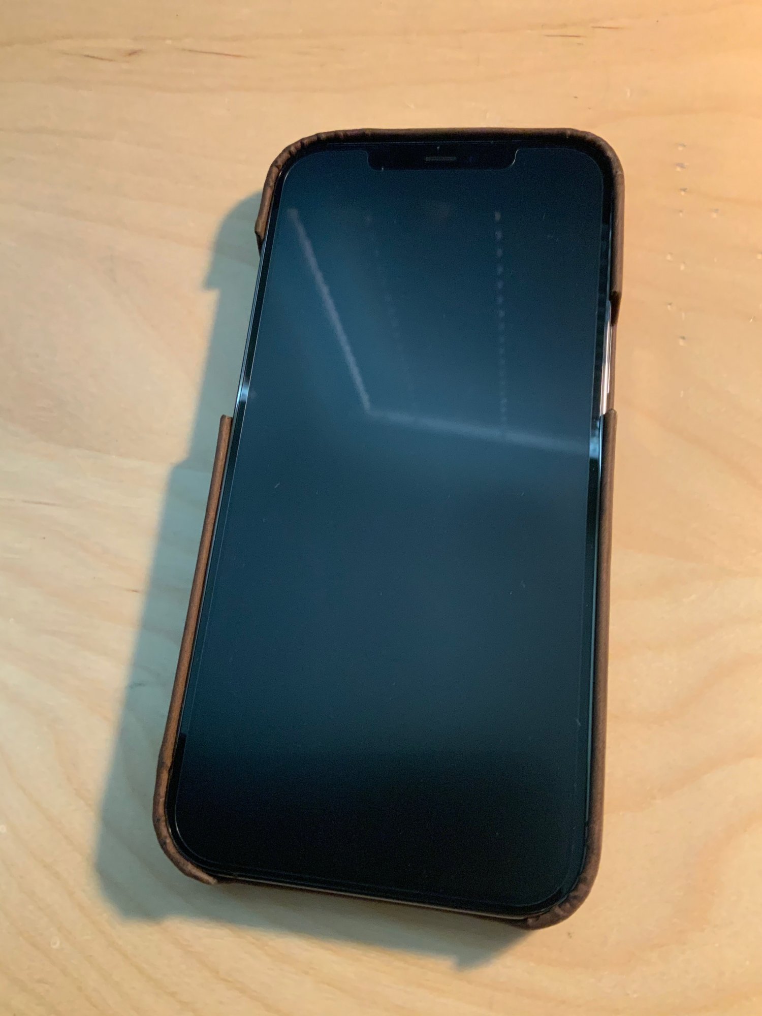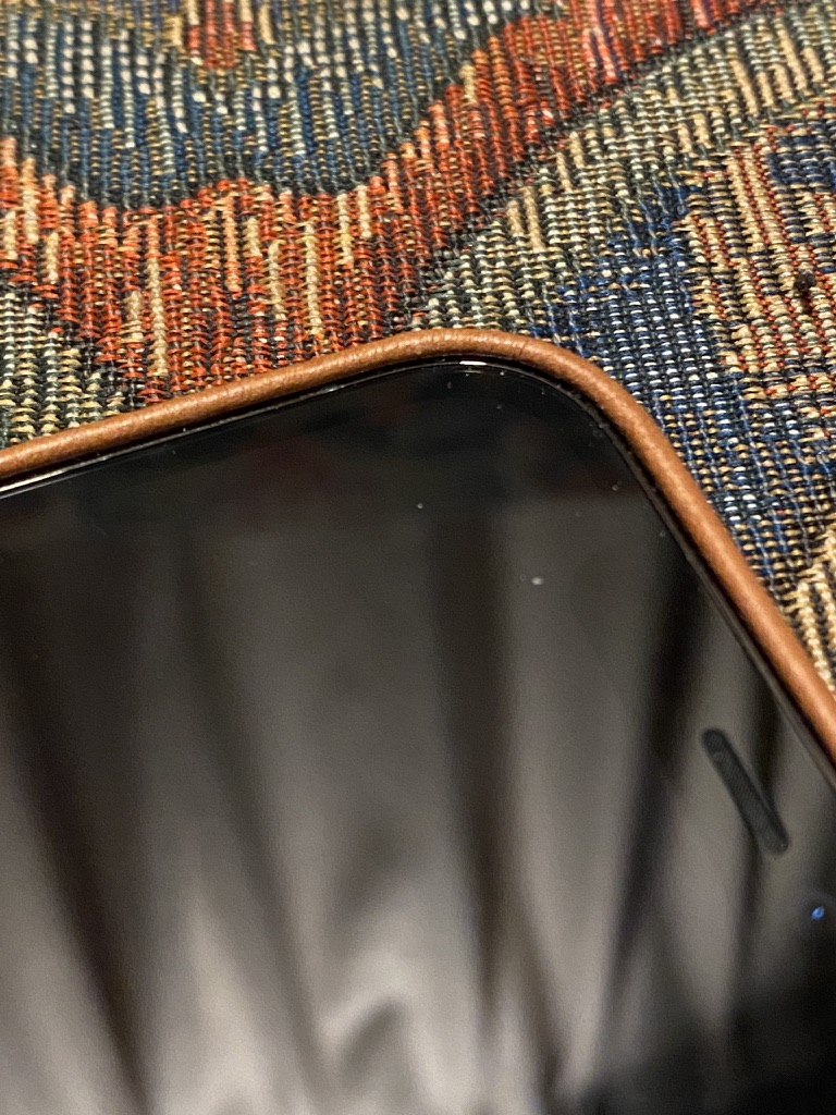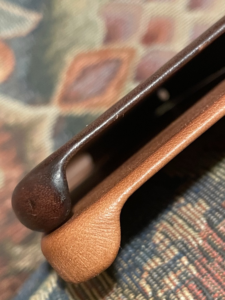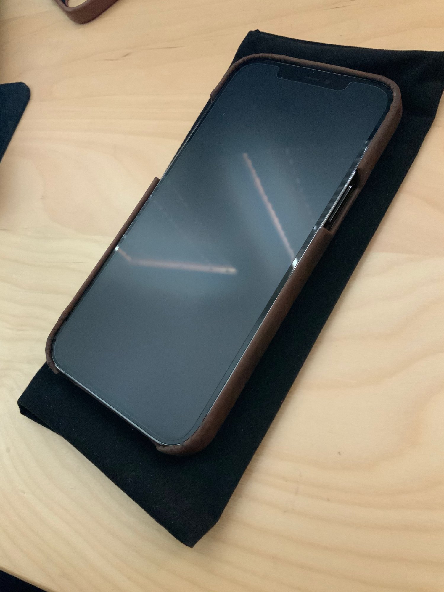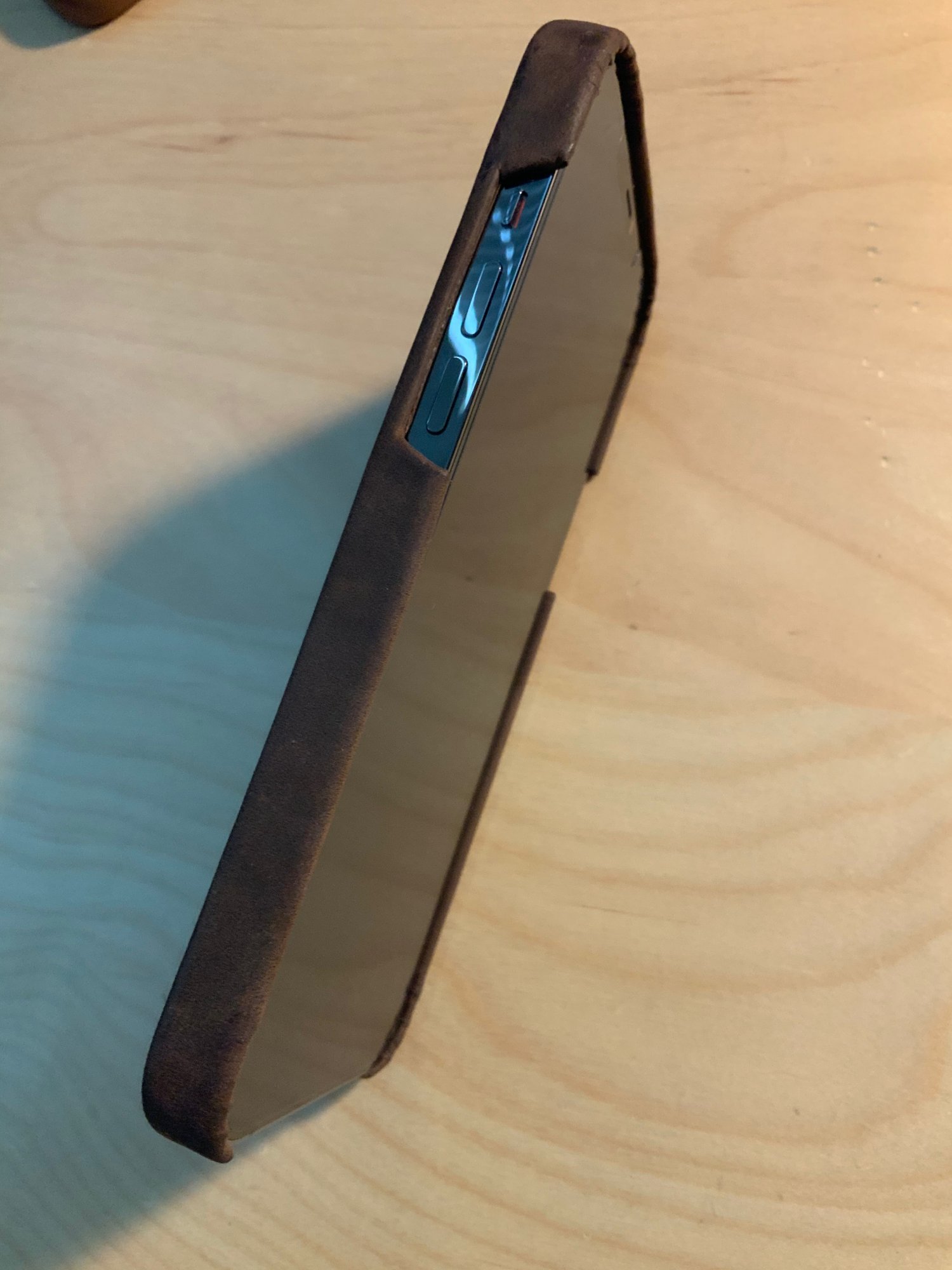 The nail in the cutout's coffin, though, is that the Apple case makes a "click" when you set it down, because the plastic rim is ever-so-slightly higher than the surface of the leather (the 12pm must be even worse, how can you stand it?!). I reckon that's going to keep the leather from fully contacting the surface you've set it on, and so even further prevent the patina. The Bullstrap case has that nice soft "thump" when I set it down on a wood tabletop—and it slides like pure leather, not like something with a plastic standoff.