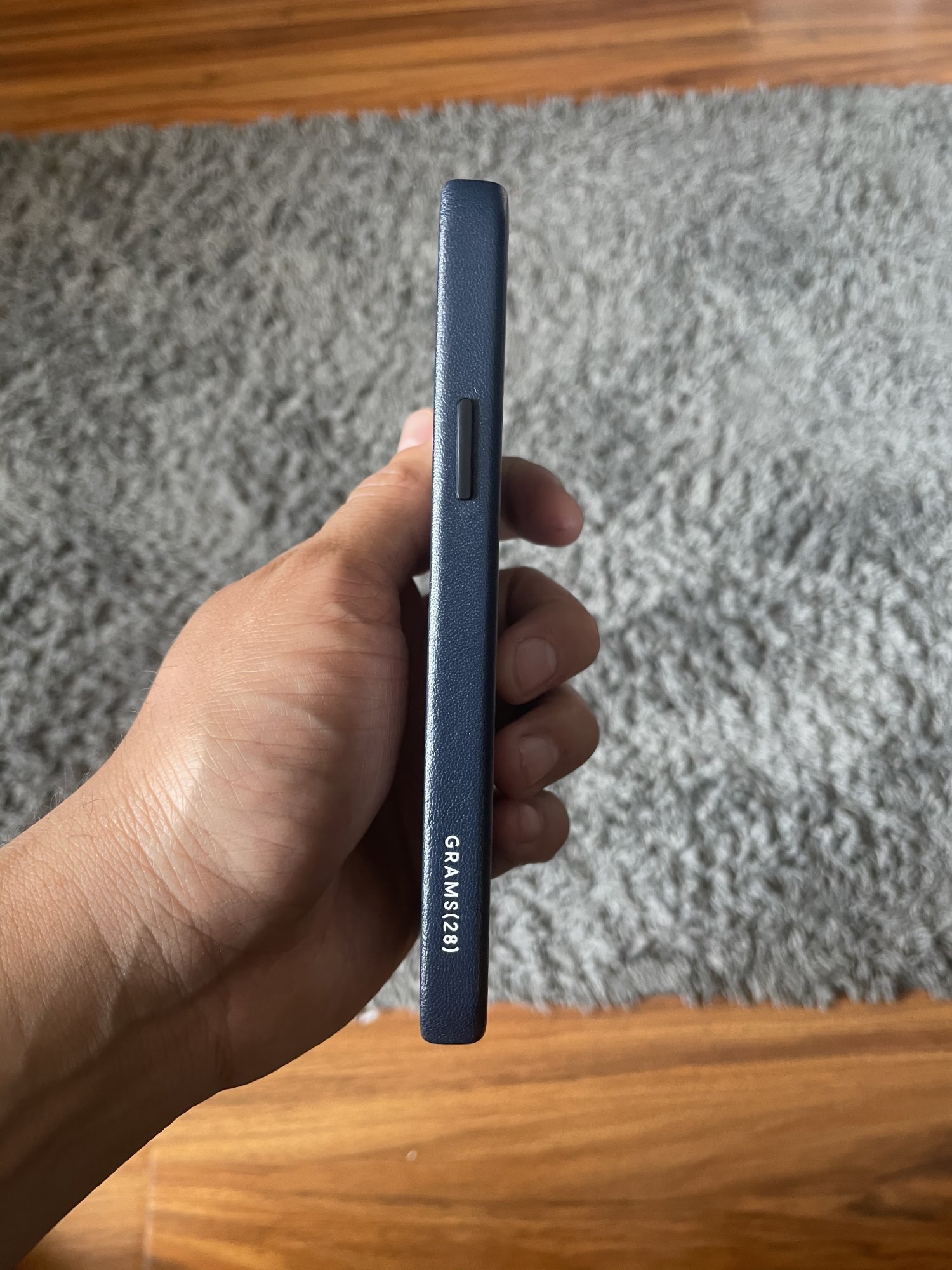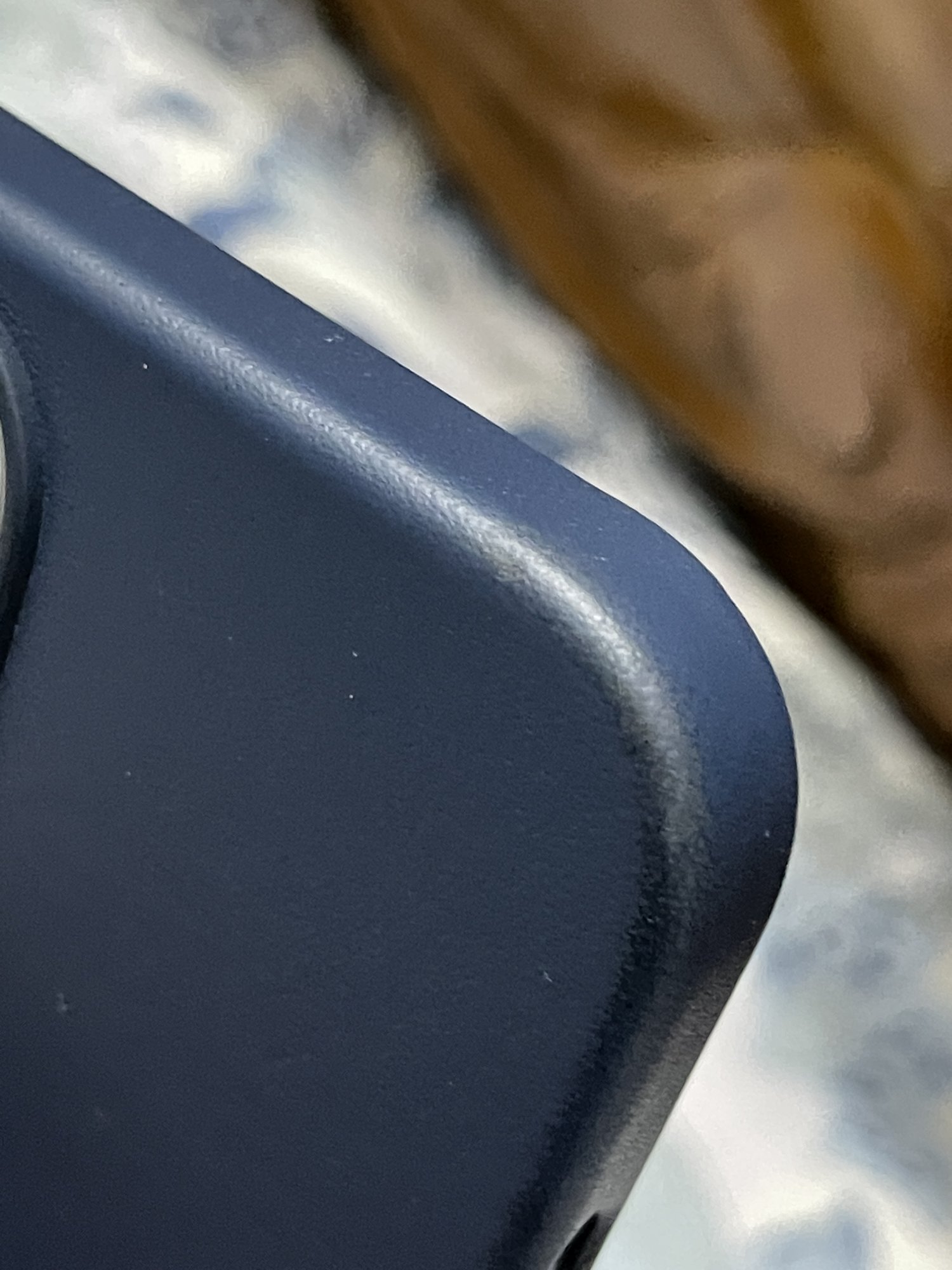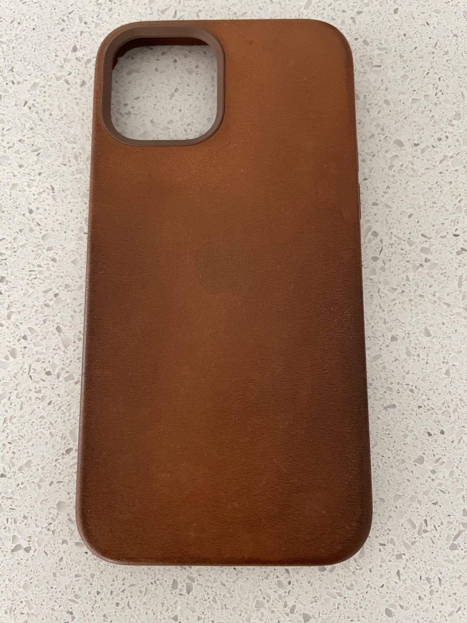 Here’s the black leather after a couple of weeks with a MagSafe wallet (notice the line just under the camera cutout) and four days of snowboarding.