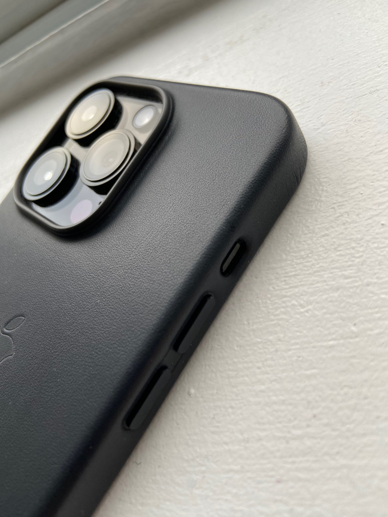 The black leather has been my jam for the past couple of years. If I get tired of Umber, I'm getting this! What a classy combo!Launch day 14 Pro Midnight case, just over 3 weeks ago. MagSafe ring is visible but that's fine and what I expected. Surprisingly the first sign of wear is right above the ring/silent switch. It's faint, but it's there. I don't baby the phone or case but I also don't treat it poorly just because.