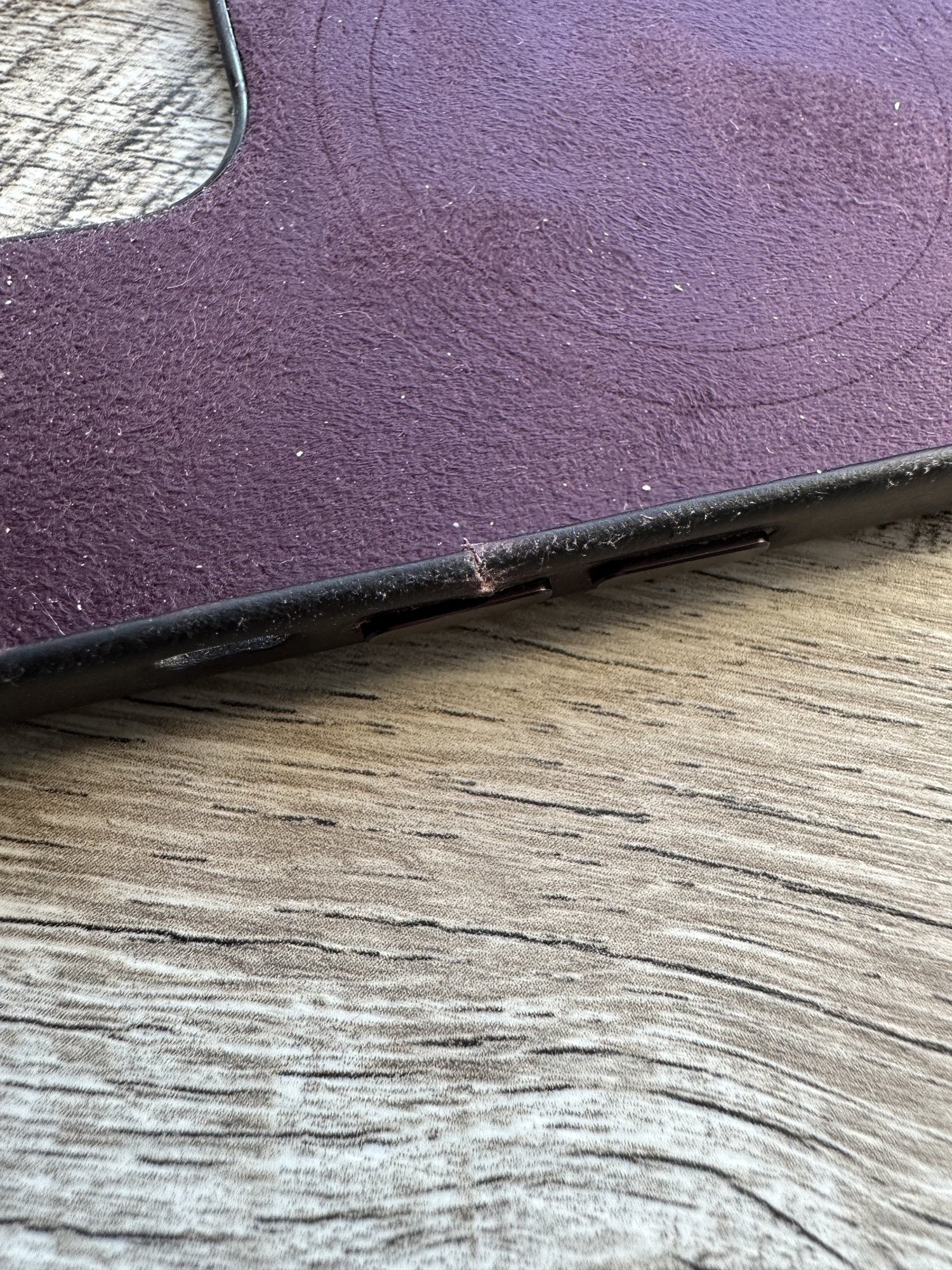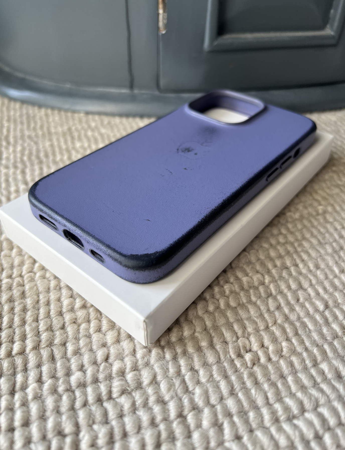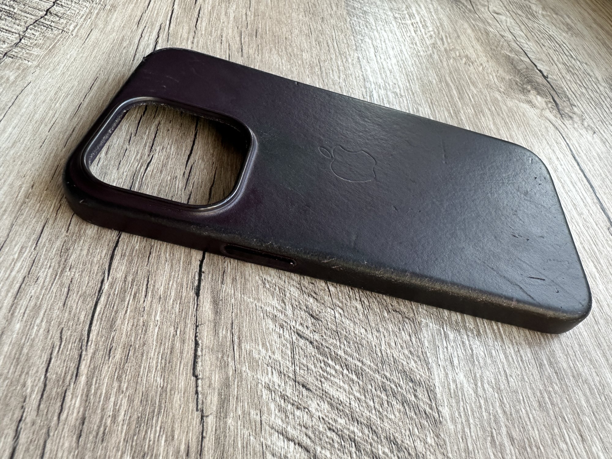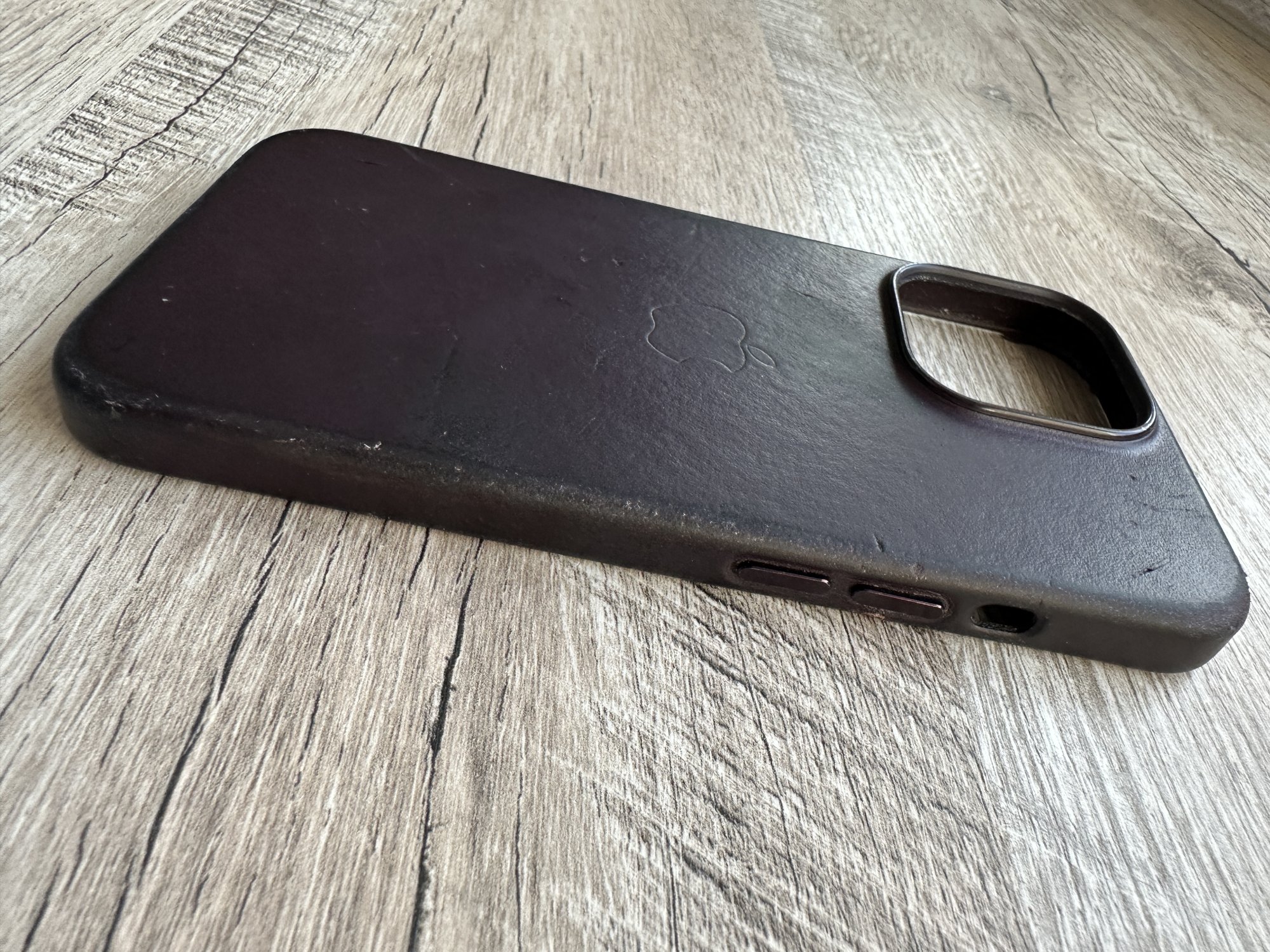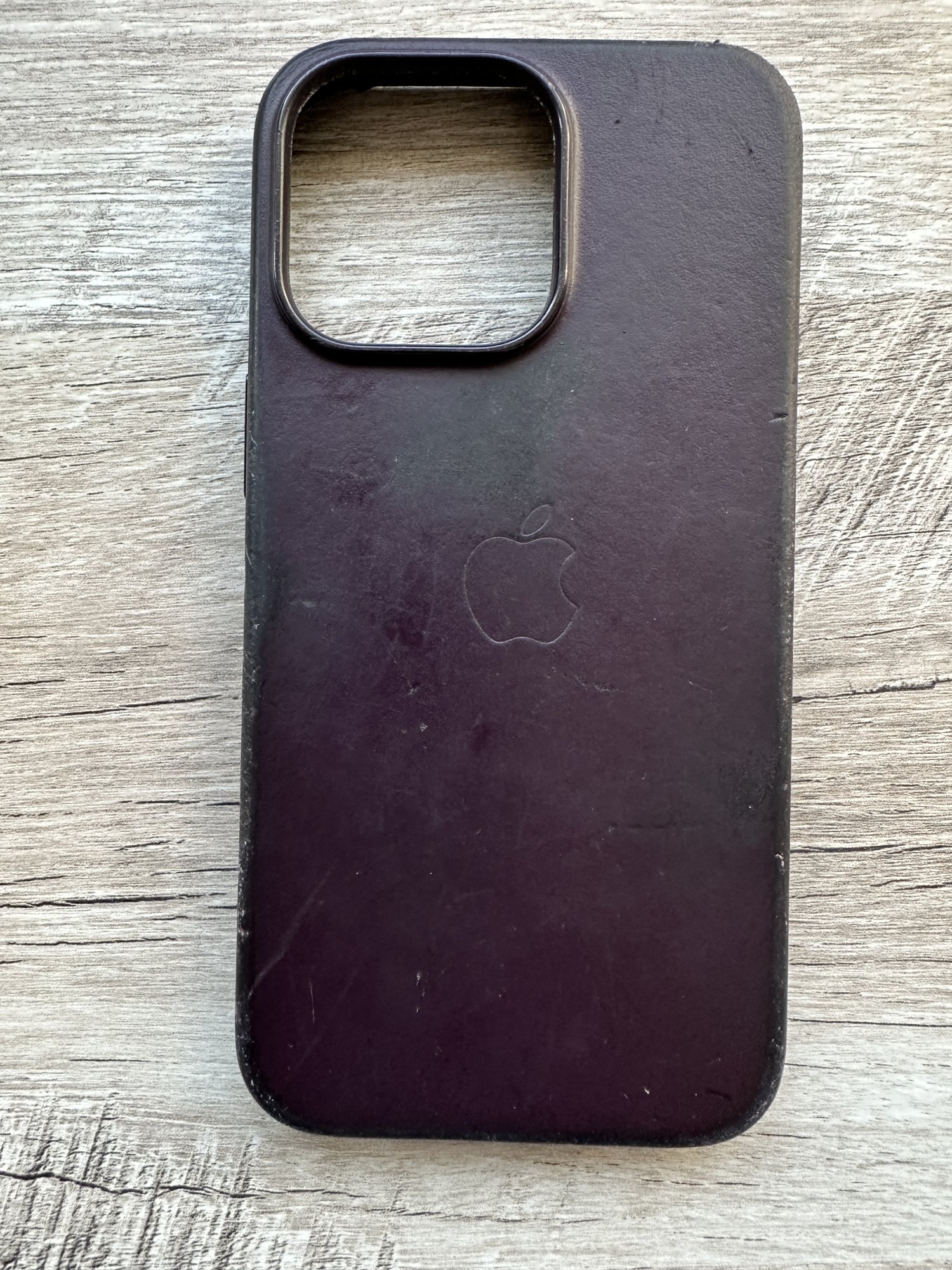 1 Year Old 13 Pro Leather Case (Dark Cherry)... tbh I personally think it looks like s**t. If I wouldnt have switched to 14 PM i would have probably get myself a new one. I also noticed when I made the photos that it was broken where the volume buttons are. I dunno since when that was there.