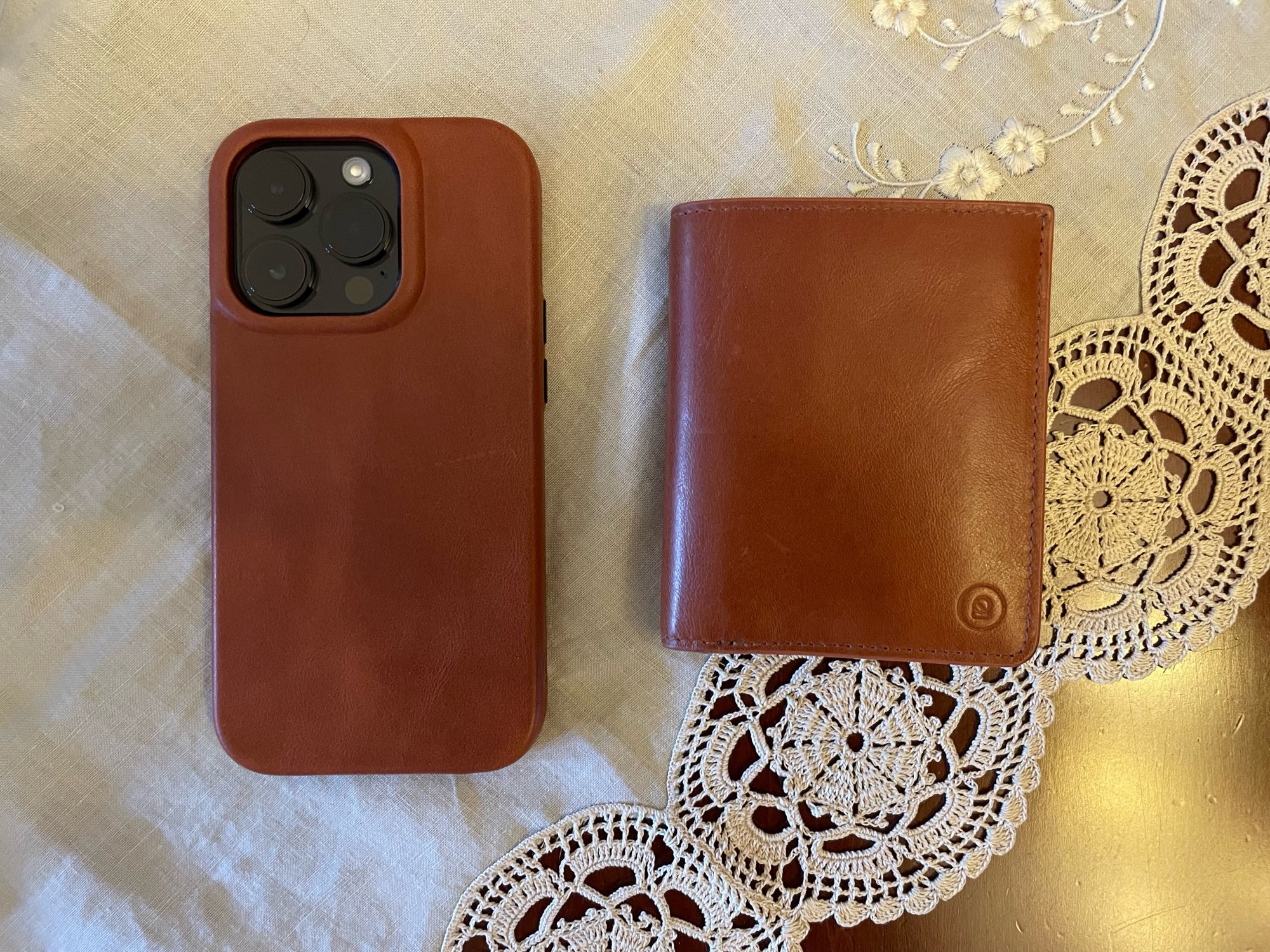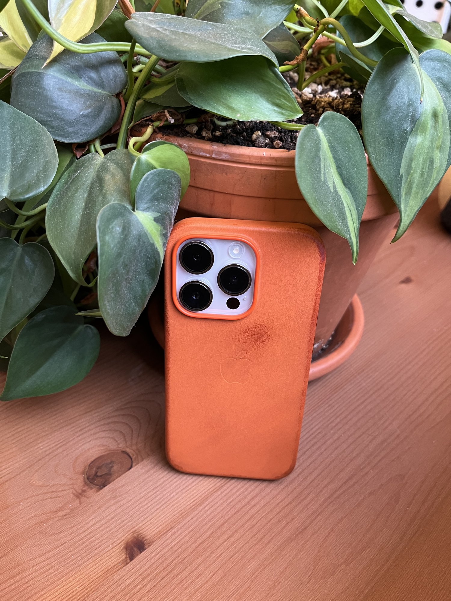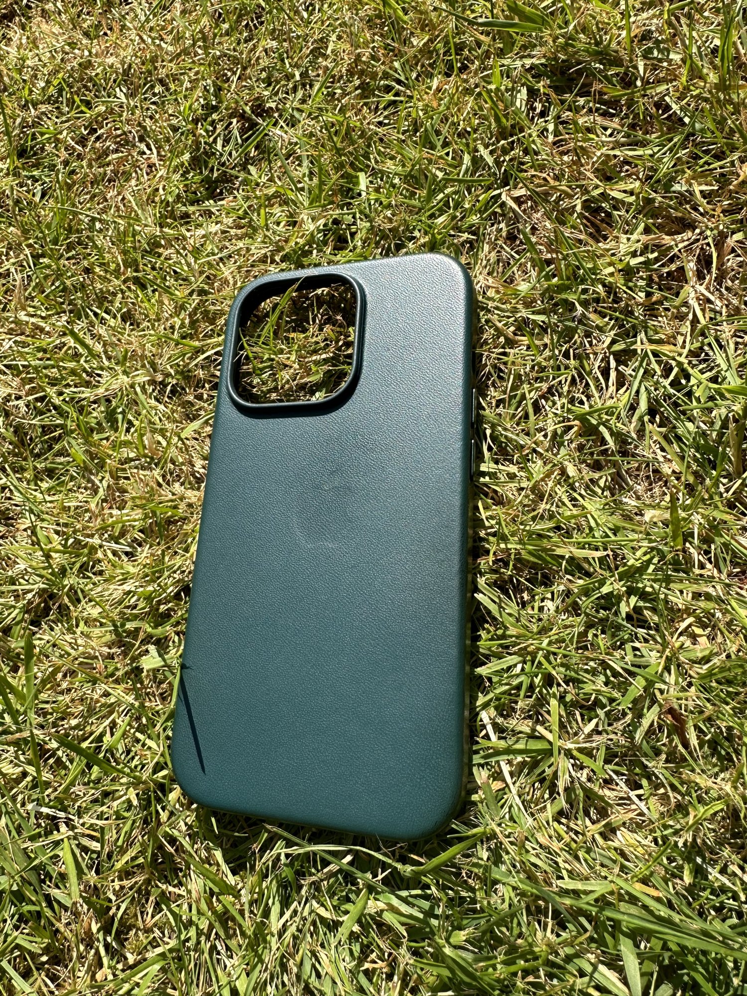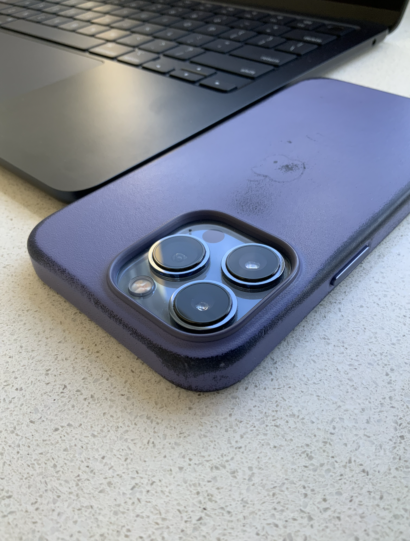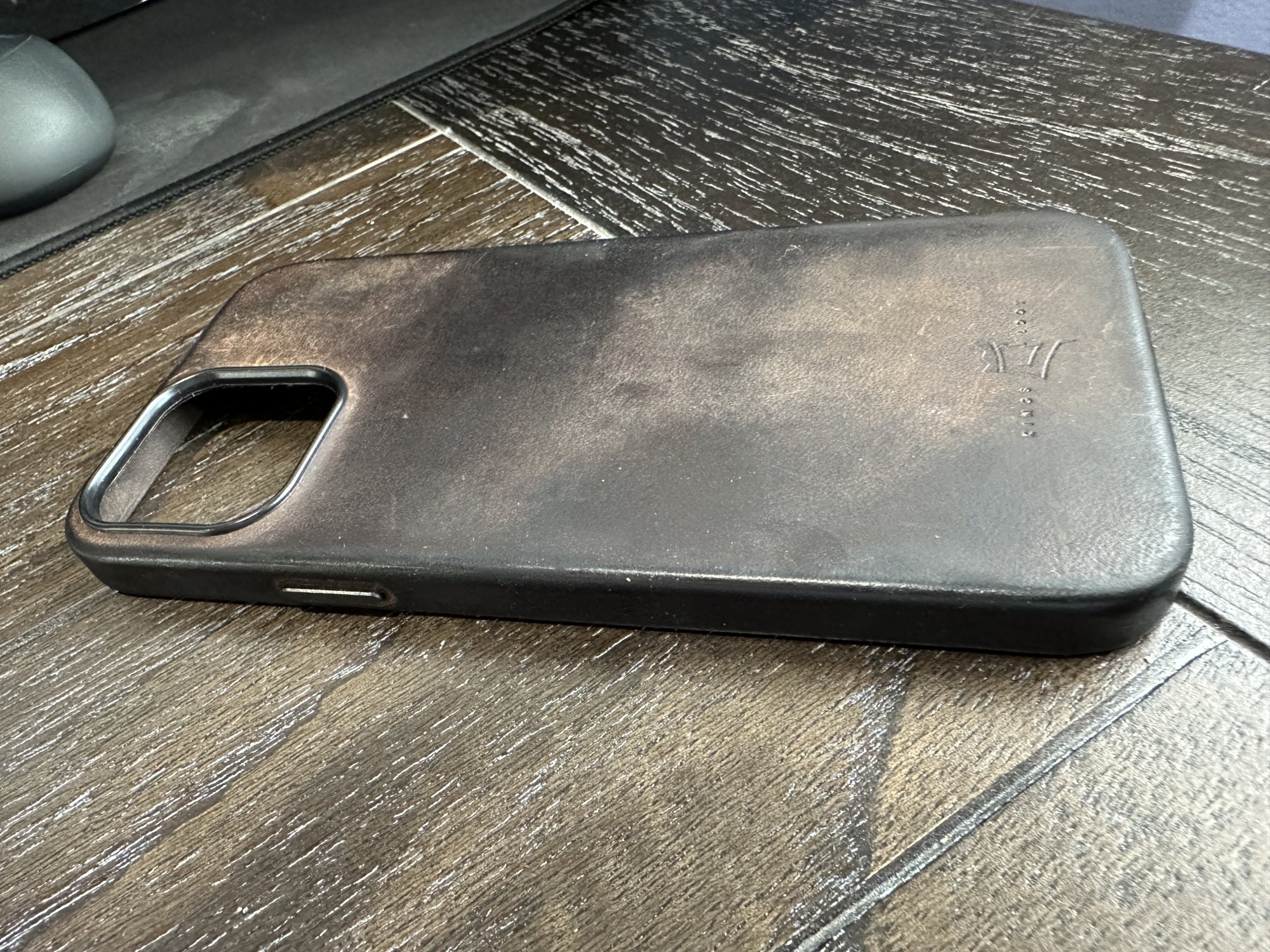 1 Year Old 13 Pro Leather Case (Dark Cherry)... tbh I personally think it looks like s**t. If I wouldnt have switched to 14 PM i would have probably get myself a new one. I also noticed when I made the photos that it was broken where the volume buttons are. I dunno since when that was there.