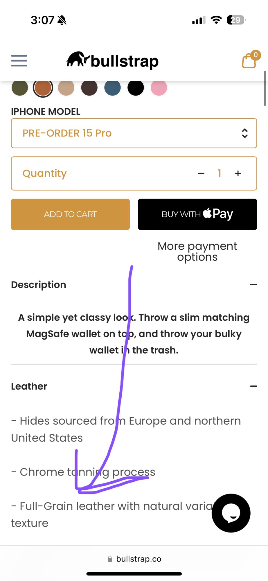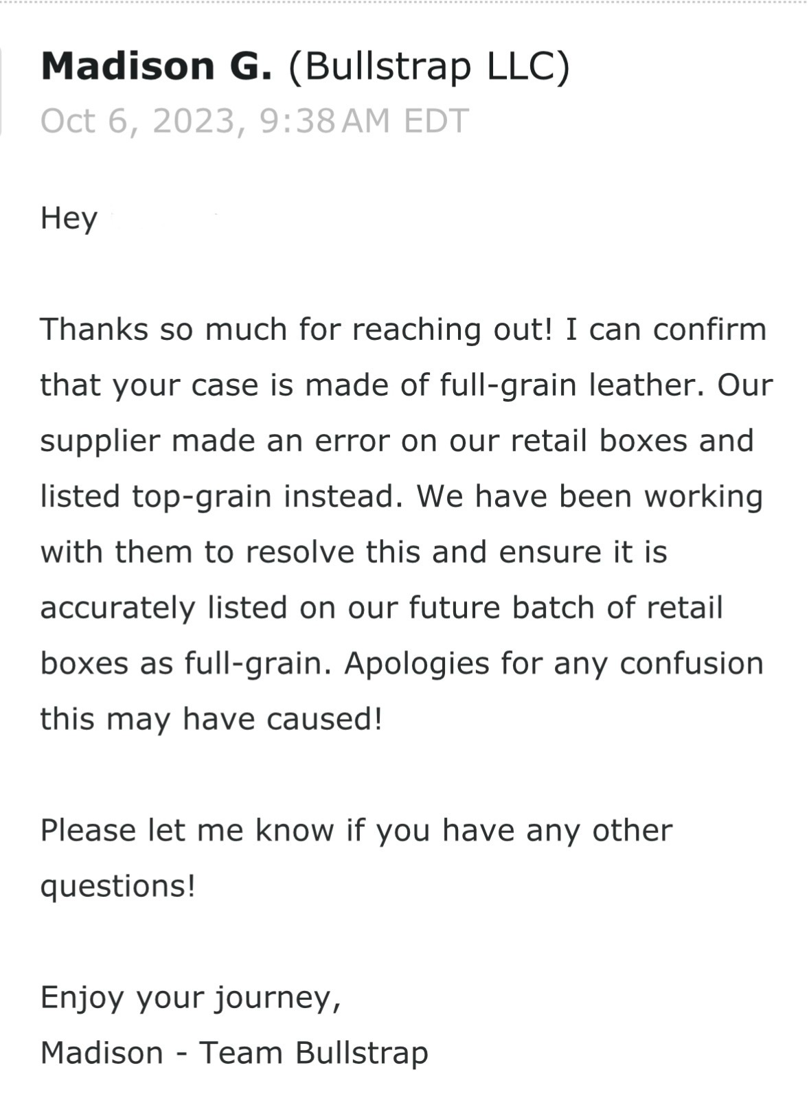 Reply from bullstrap regarding full grain showing on website and top grain showing on back of box.