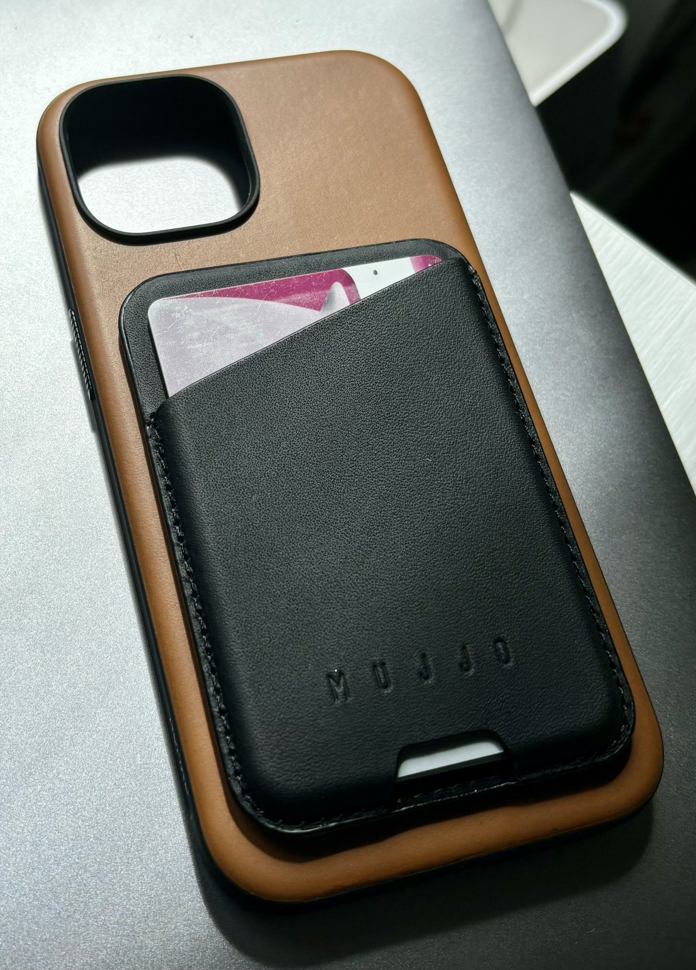 Really like that. I’m on the second week of mine and surprised how quickly the edges are starting to patina but not complaining!Nomad modern leather in English Tan with Mujjo MagSafe wallet in black leather