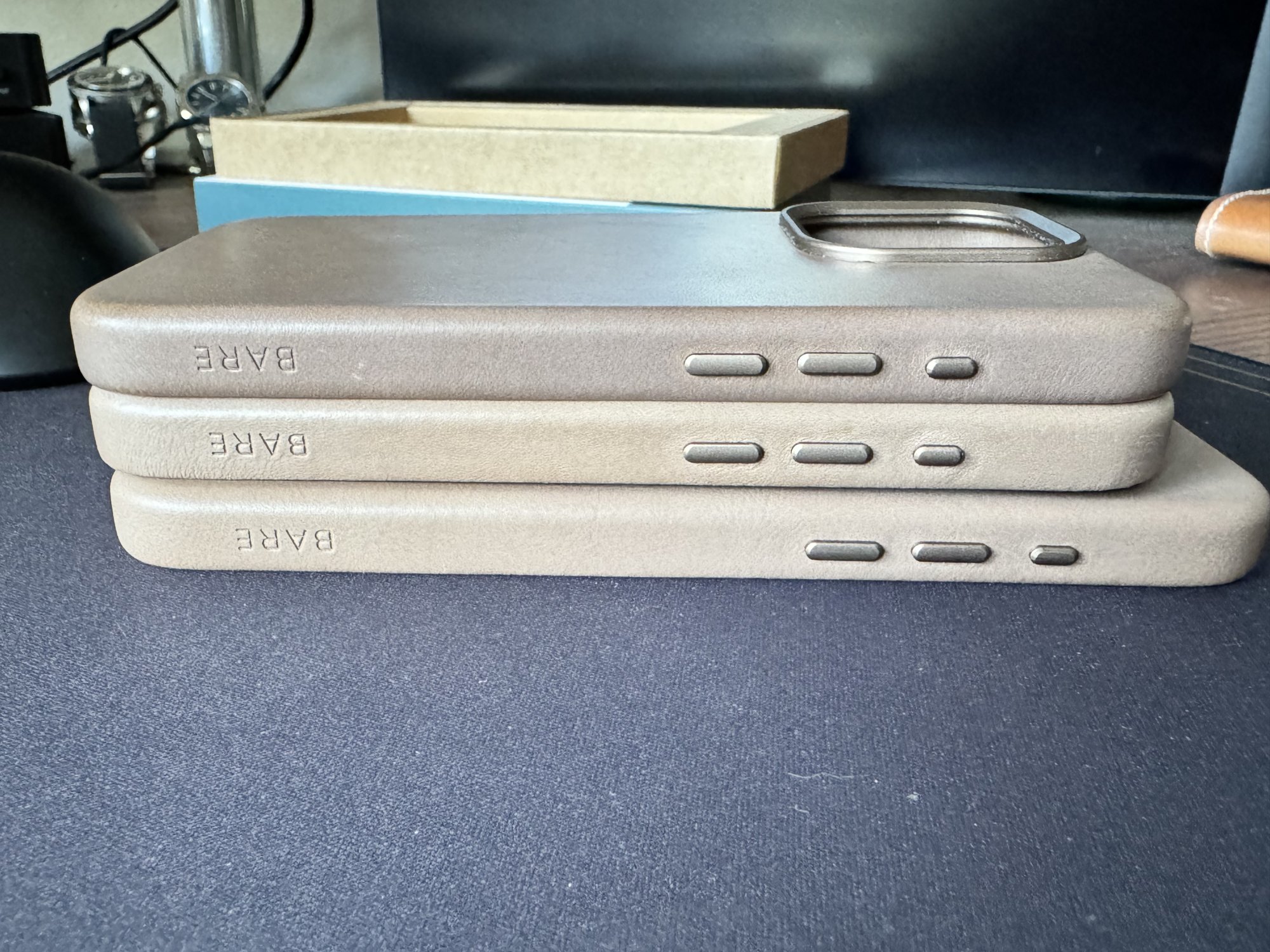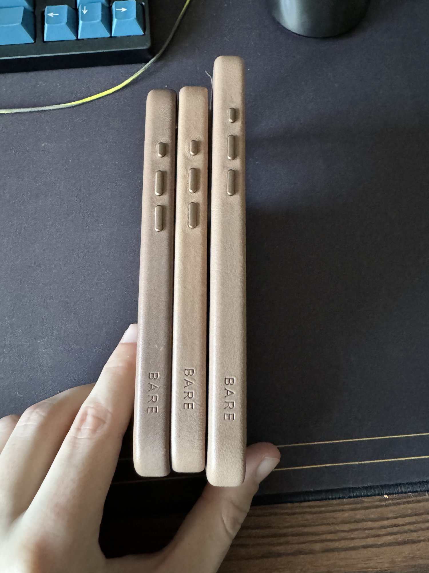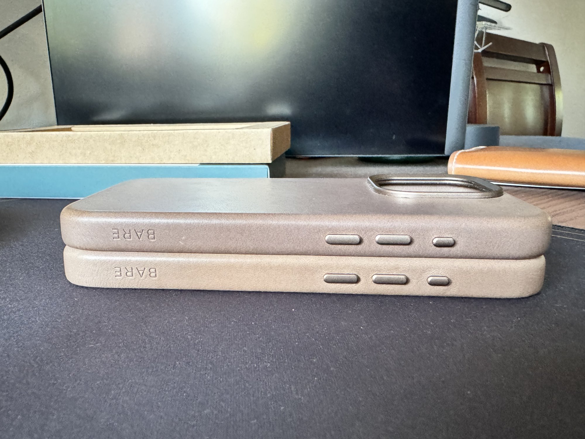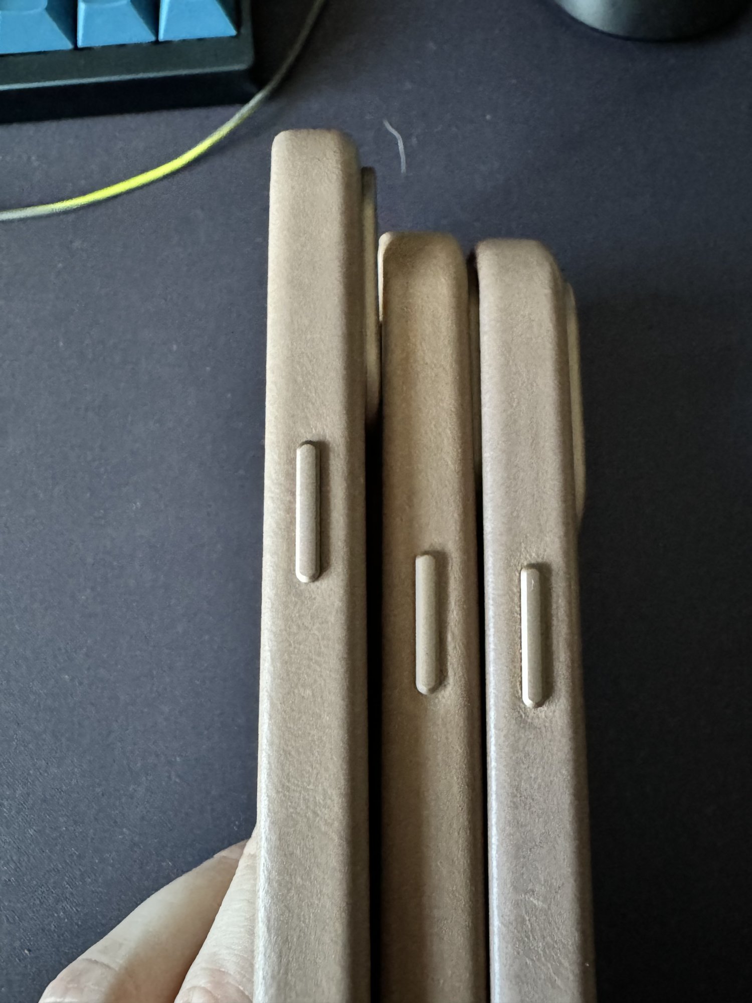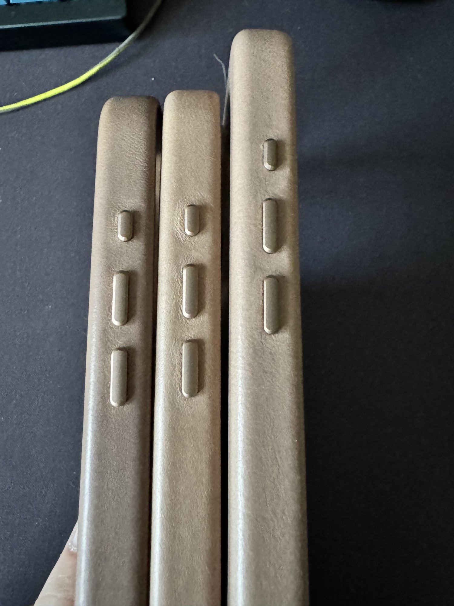 Ohh gotcha. Here is a pic of my 13pro apple leather (Green) and the Andar (tan) I had for my 15pro. The Andar is a lot thicker and has the most pronounced lip of any of the leather cases I’ve tried. The bare is thicker than apples but not as bad as Andar.im curious about the sides width/lip thickness.