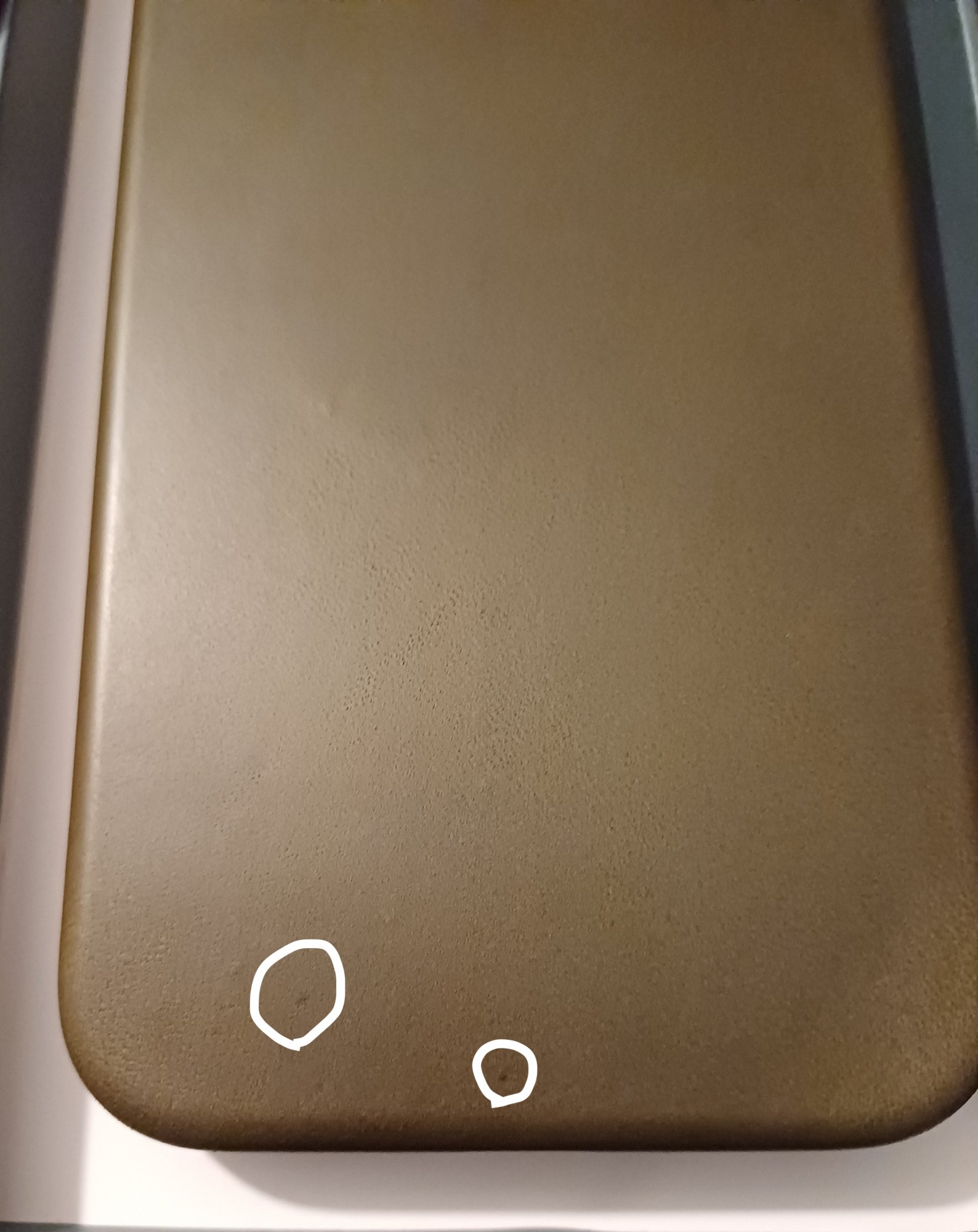 There are two little Black dots on the back of the case. I know leather marks up easily, but the case is new so there should be no markings. I also find the corners on the back of the case rough feeling and lighter in colour than the rest of the case..surely this cannot be right? The issues are not visible in pics and only visible when the case is in front of you.