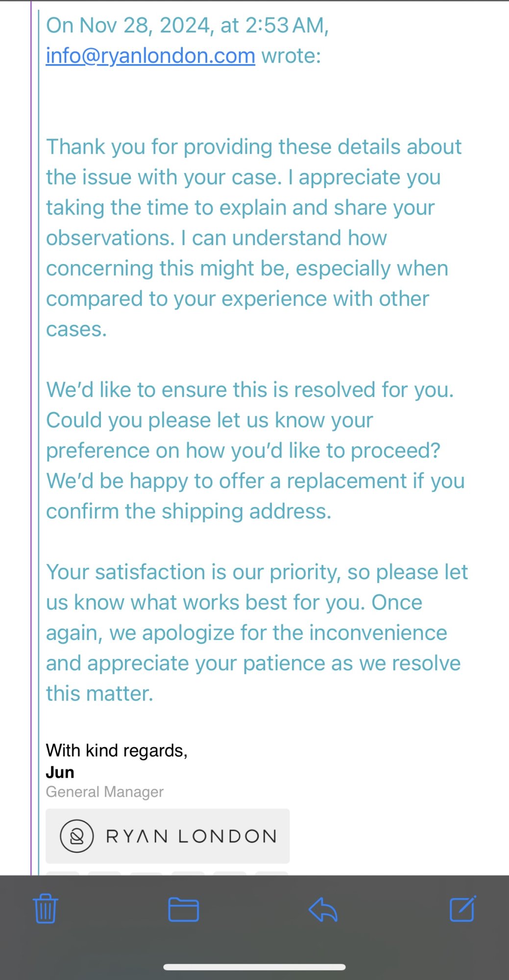 In contrast here’s the email I received from RL for my replacement: View attachment 2458921