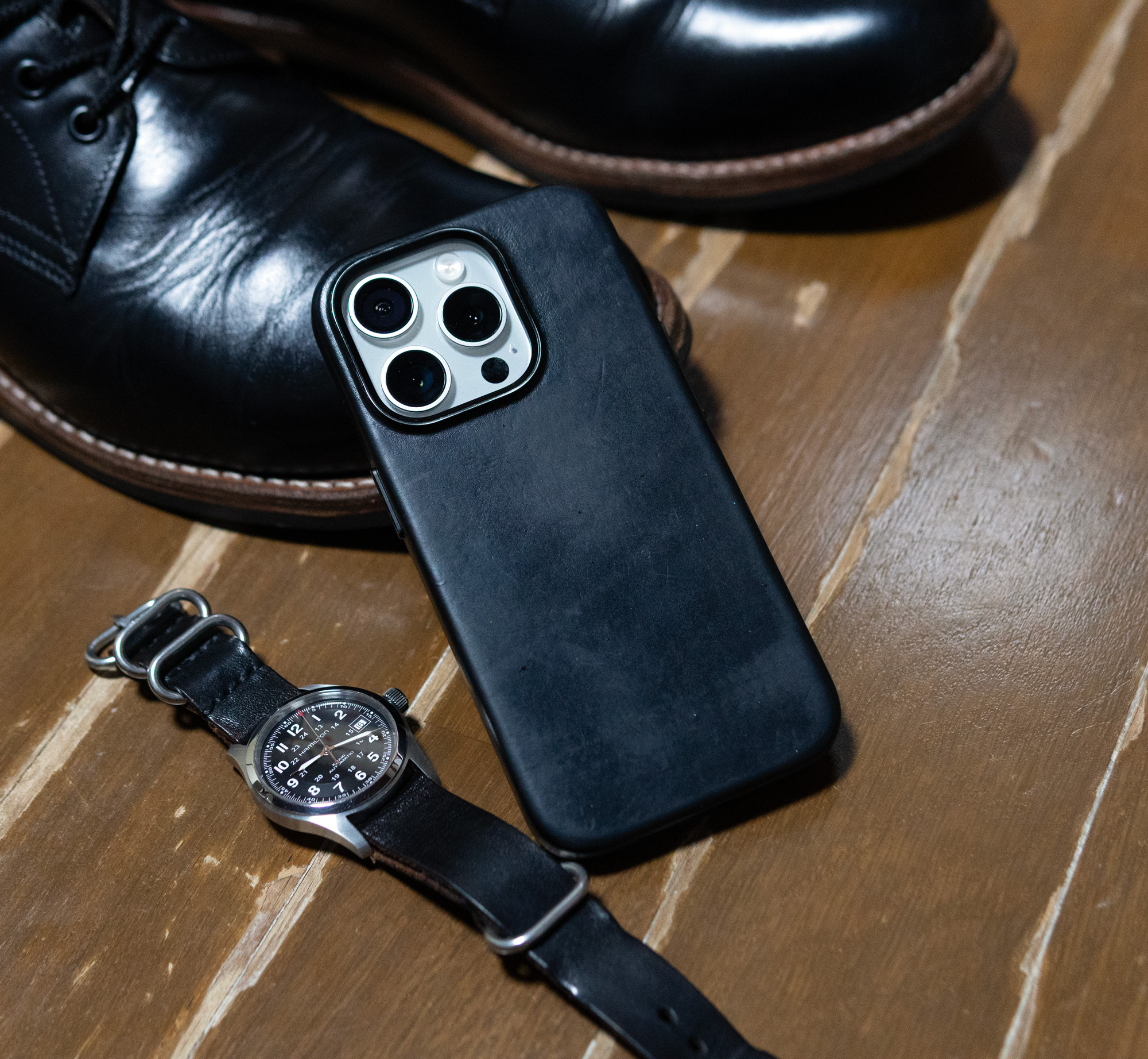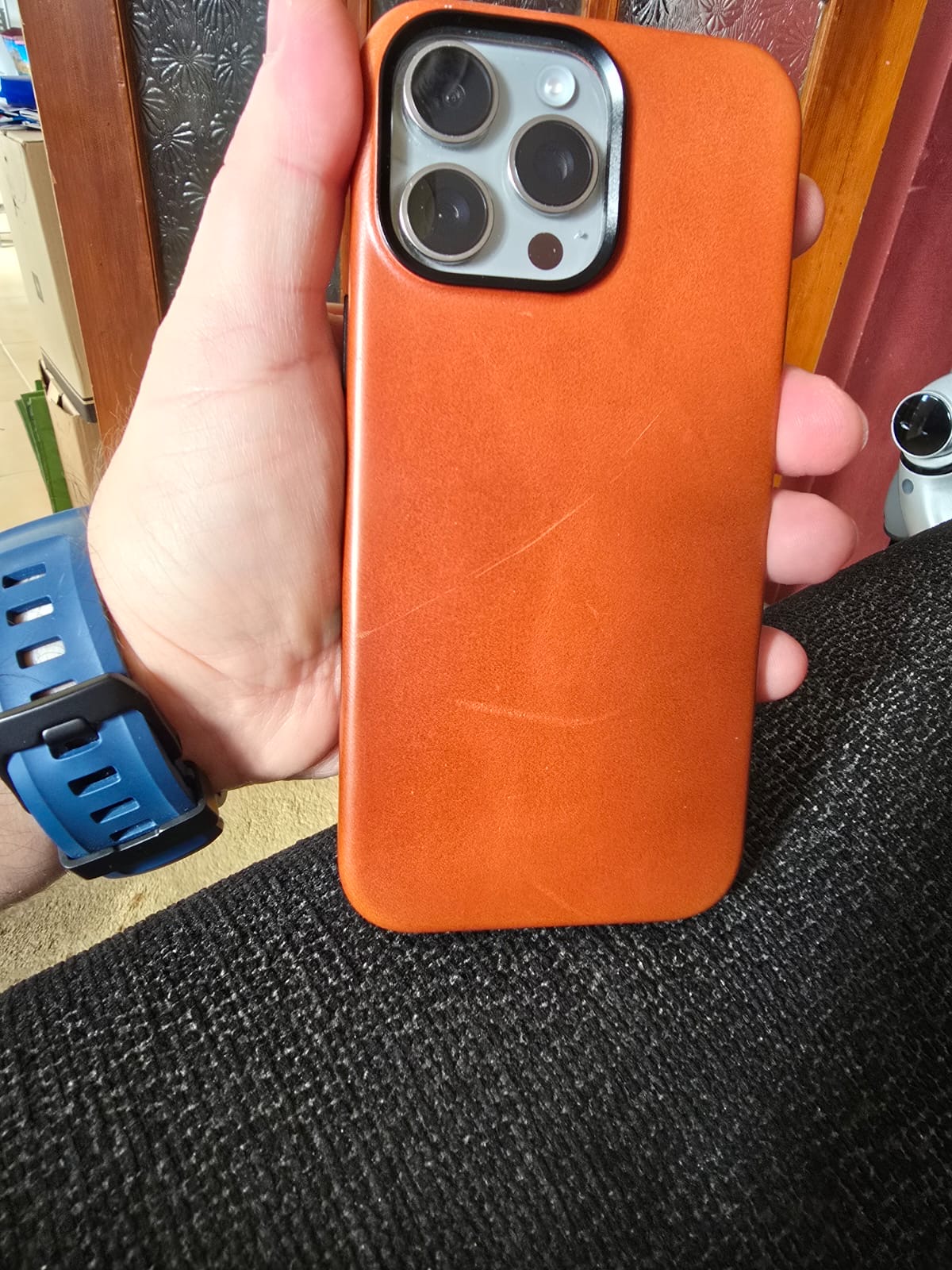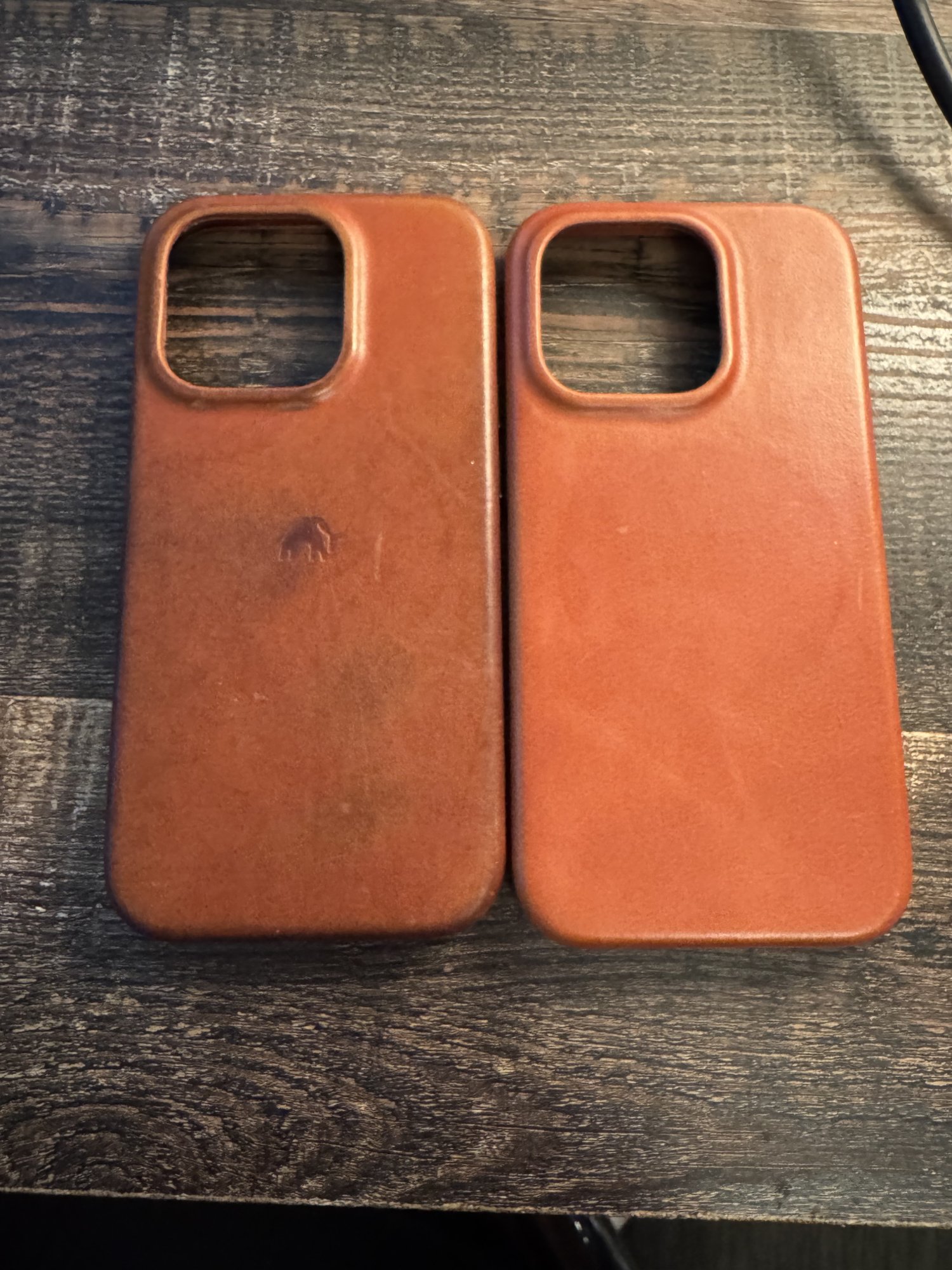 Here's an approximately one year old Ryan London case on an iPhone 15 Pro beside 2 other items purchase around the same time. I also own the saddle brown version and I will photograph it when my worldly belongings arrive at my new home in Japan. I really hate the way the saddle brown looked after 4 months of use being switched back and forth with this black case. I think it patina'd terribly compared to other saddle brown leather items I own.