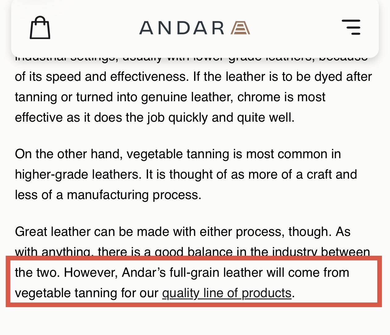 My Aspen looks like veg tanned leather to me.ohh i see now. thanks. i wasnt able to find it on the product page of the Aspen so i was wondering.