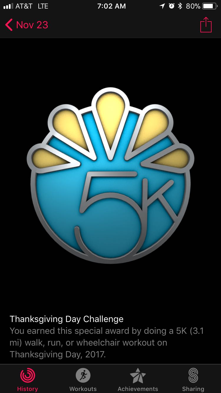 I did a 10k recorded in Runkeeper, but no badge. At the end of the day, I did a 3.25 mile walk recorded in the workout app. No badge. I also should have both 200 and 300 achievements, but they didn’t register either.More dog walks!!! Fridays, Saturdays and Sundays I do a six mile loop in the local conservation land with one of our dogs (the other one is 12 years old and is still active for her age but isn't interested in walks that long). I don't usually turn on the "workout" app but did and got the badge right away.