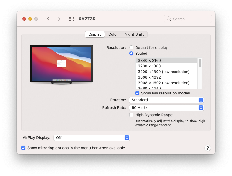 Ok, that is awesome. I never thought it is possible to get night shift, full resolution and high refresh rate. Acer does seem to have figured out how to support Macs... How is the monitor connected? Is it DP or TB? Maybe it's worth a try connecting the monitor over DP. I only had it ever connected over TB.There is no limit in refresh rate in macOS. Click "Show low resolution modes" also.