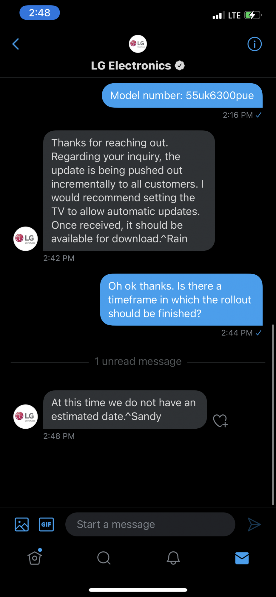 I tried to set it up but I could not get my LG to appear in Home. After you install the plugin, how do you actually get the device to appear in Homekit? (I'm using HOOBS)I recently used HomeBridge to bring my LG OLED B8 into HomeKit and I'm super happy with the functionality. I can turn on/off, control volume through ARC to my Sonos Arc, and can switch inputs and tie it into scenes. Might be an option for those that cannot wait for official support. Took about 5 minutes to setup and configure