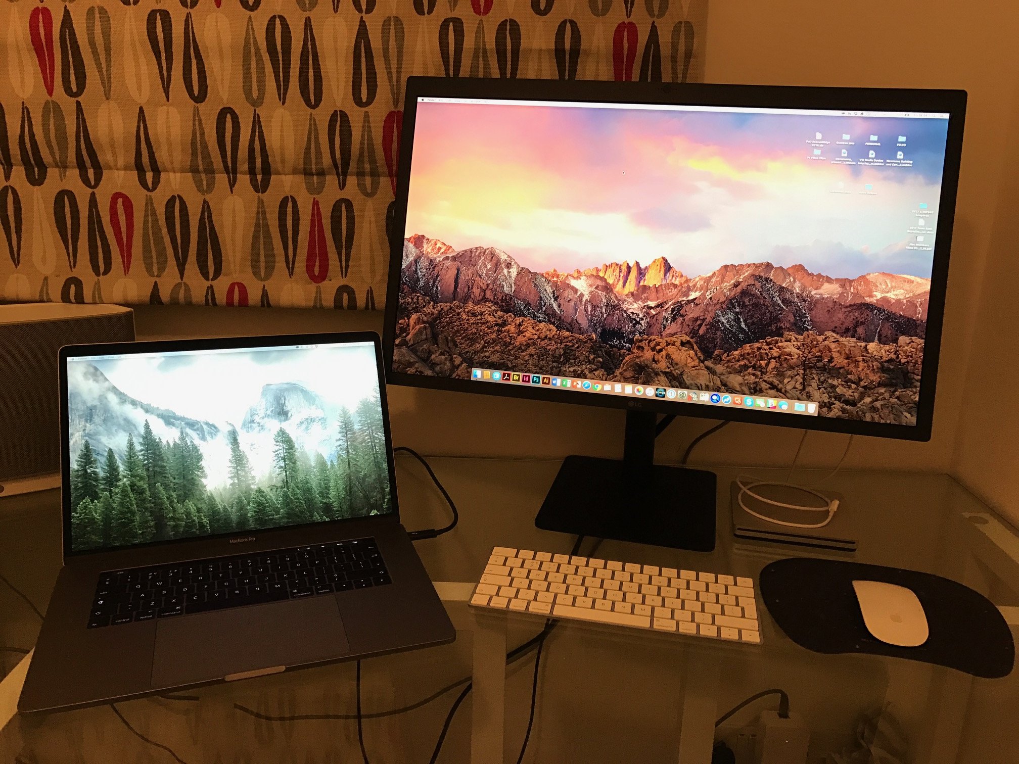 One caveat to mention - Of the two I ordered, the first one I set up didn't work properly; the LG screen wouldn't display an image despite powering my MBP with the supplied Thunderbolt 3 cable. Also the MBP screen kept flicking on and off (as if trying to change resolution?). Because i'd ordered two I quickly realised that one of them has a duff Thunderbolt 3 cable. After a chat with Apple Support i've made a Genius appointment to switch over the cable - so all will be good. I did consider asking in store to swap the LG supplied TB3 cable for a Belkin 2m one as carried in Apple Stores, but then realised that this only allows 60w and not the 85w that the LG 5k can push to the MBP. I hope this info proves useful to anyone else who finds themselves in this situation!