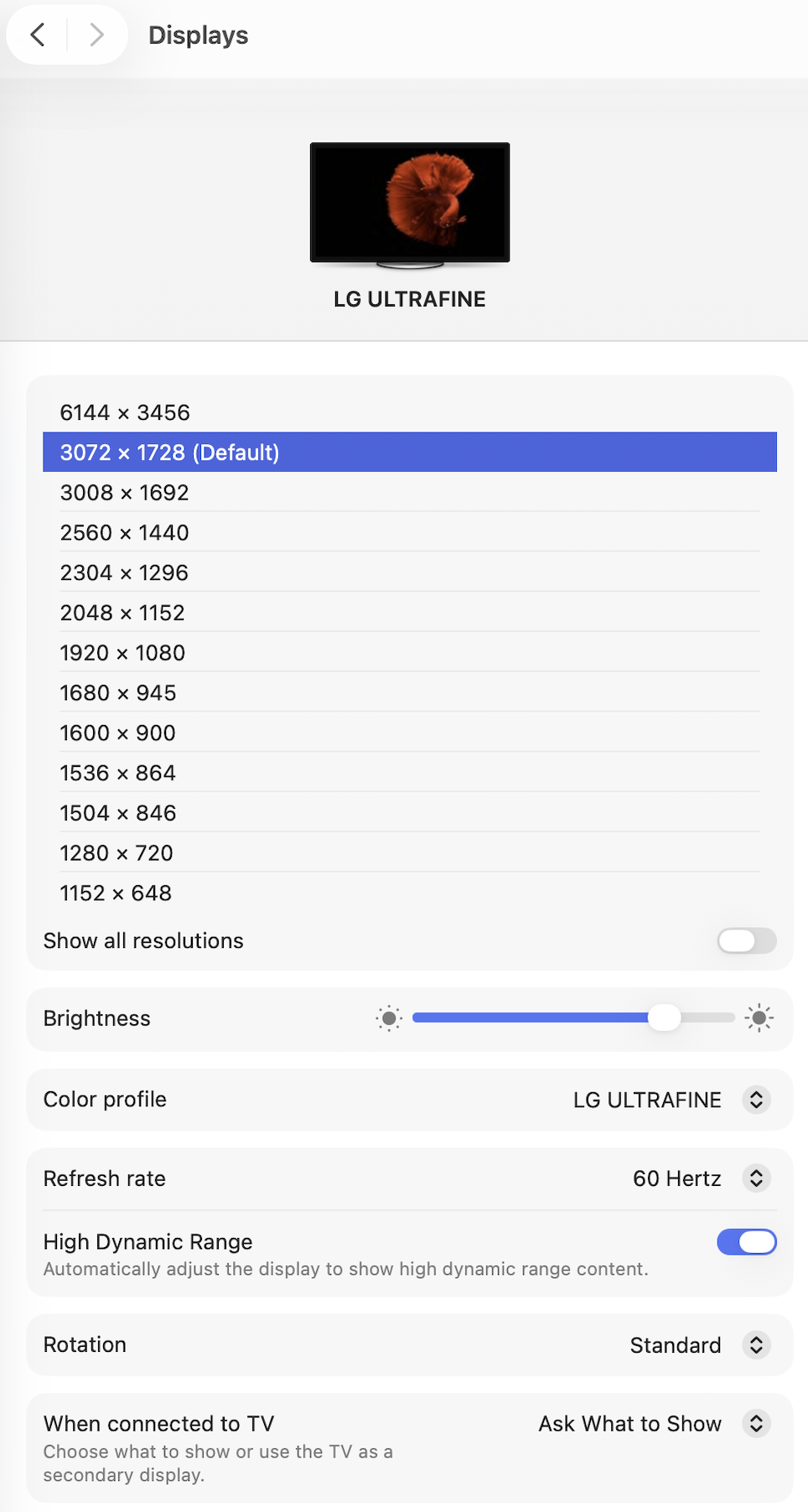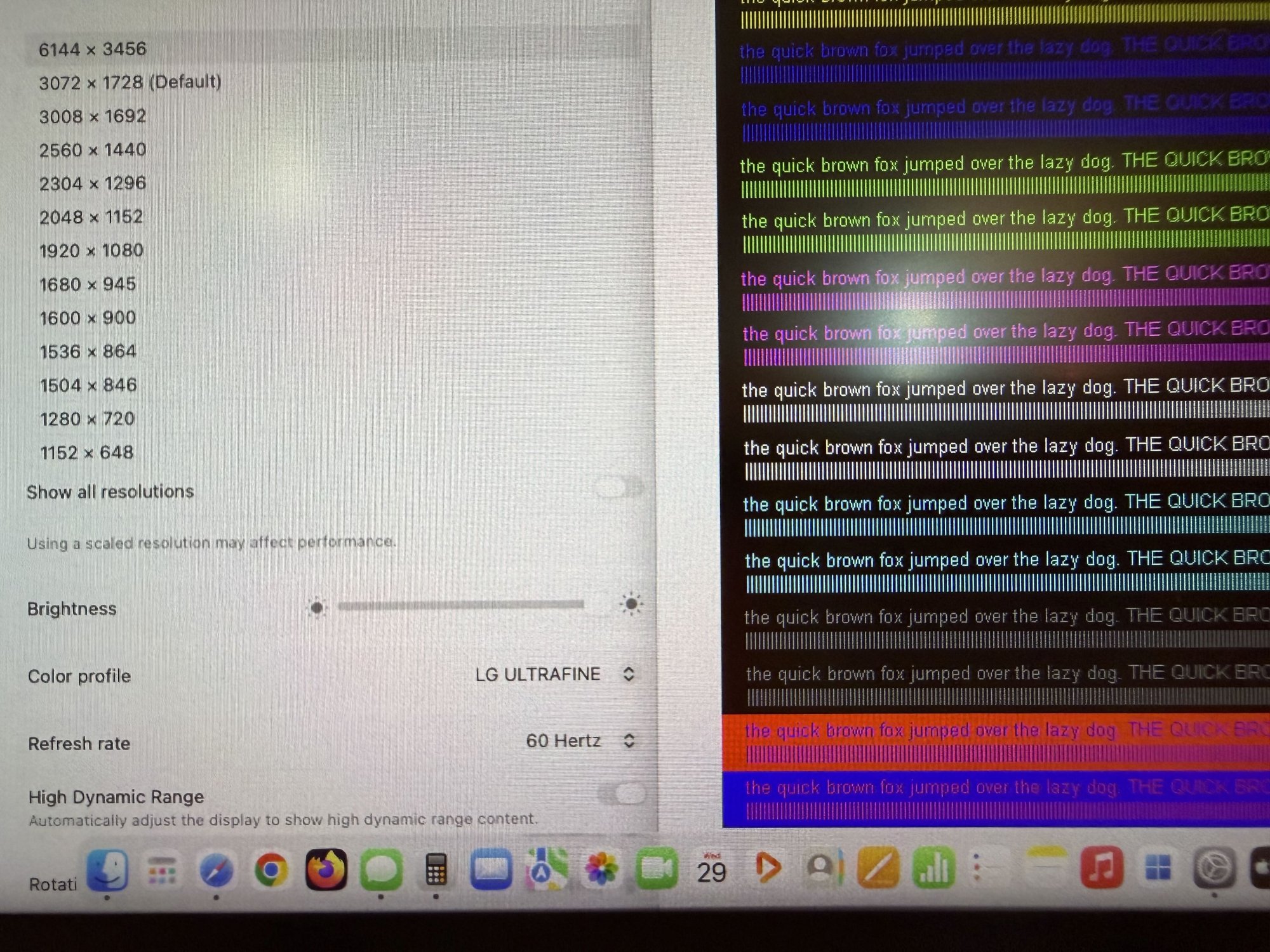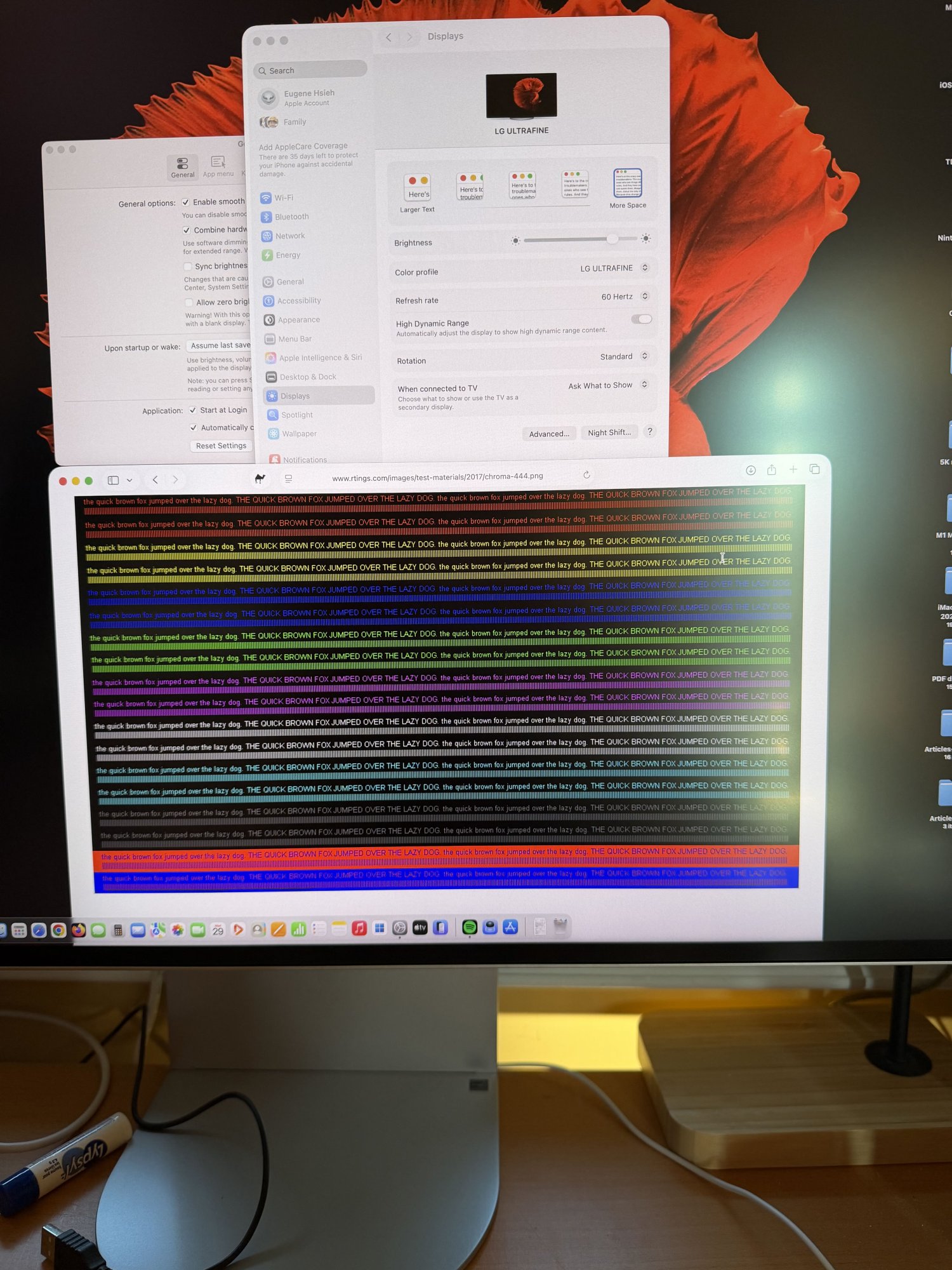 To address this, you can reduce the colour space support down to better match the intended colour spaces. If you use the built-in sRGB emulation mode, the colour accuracy is very good overall, but not excellent in every measurement. If you use the built-in DCI-P3 emulation mode, the same thing is true, with very good colour accuracy overall but not excellent in every measurement. However, the built-in DCI-P3 emulation mode is set at target gamma 2.6 which is inappropriate for most Mac users, since the default on Macs is gamma 2.2. Gamma 2.6 is good for video editors, but it seems strange to me that the LG didn't include an DCI-P3 emulation mode targeting gamma 2.2. I suspect that's what Asus did with their 6K ProArt's Mac-specific setting. So, to get proper Mac appropriate DCI-P3 colour calibration, you'll have to manually calibrate it yourself and not use any of the built-in colour space settings. For me this is not an issue, since I have a