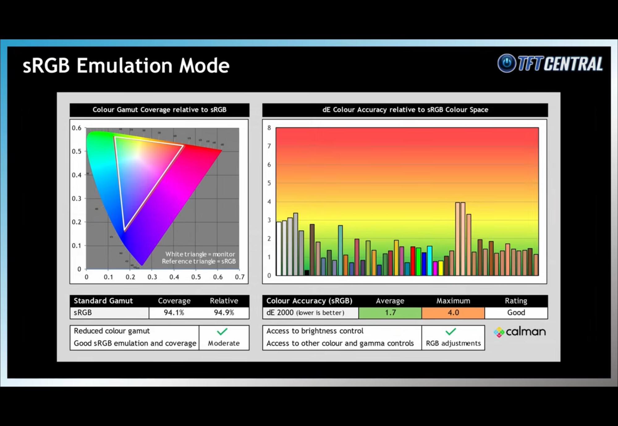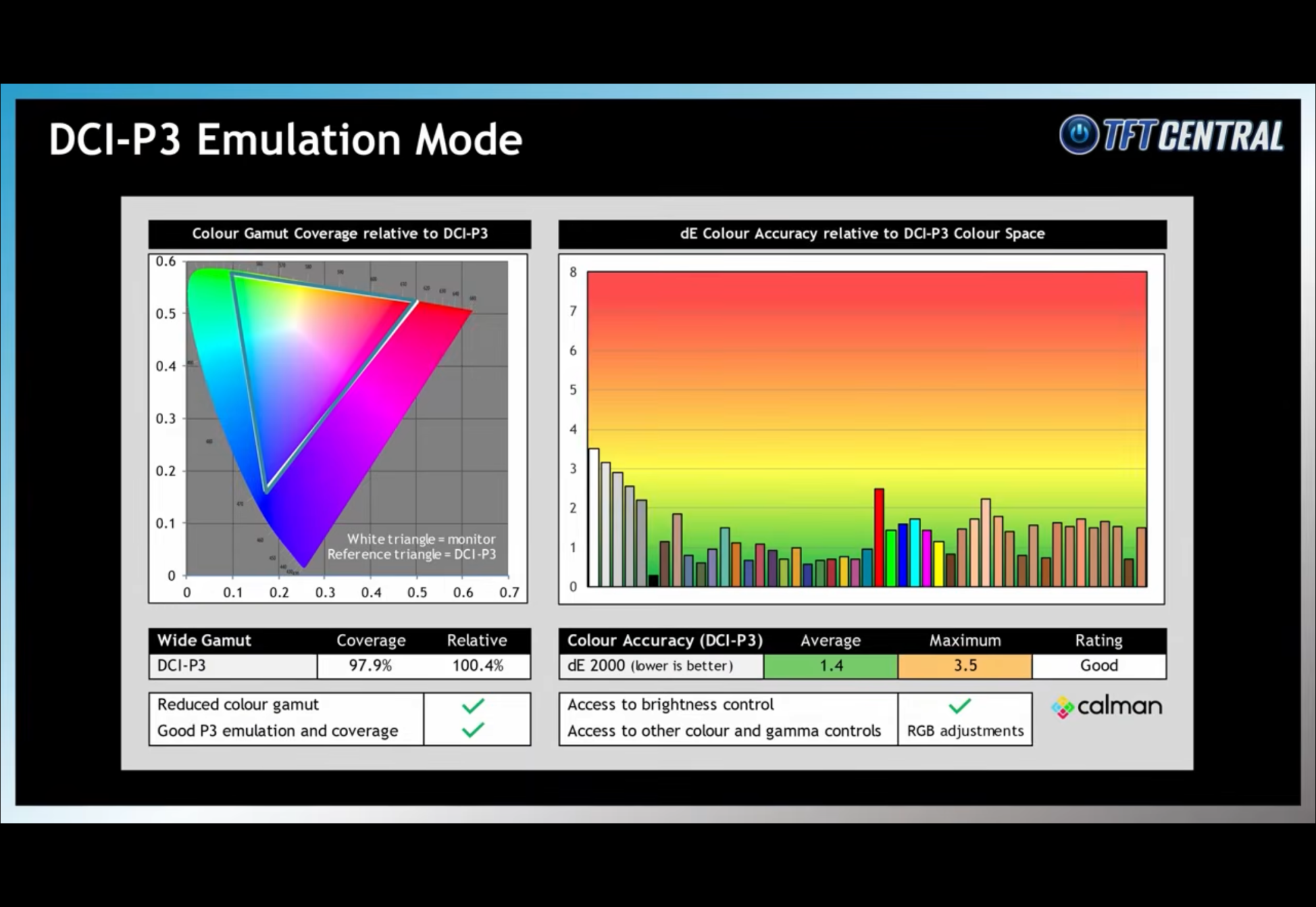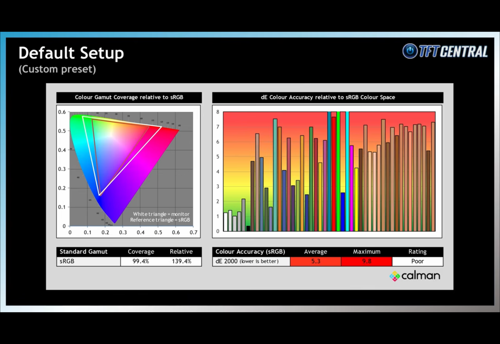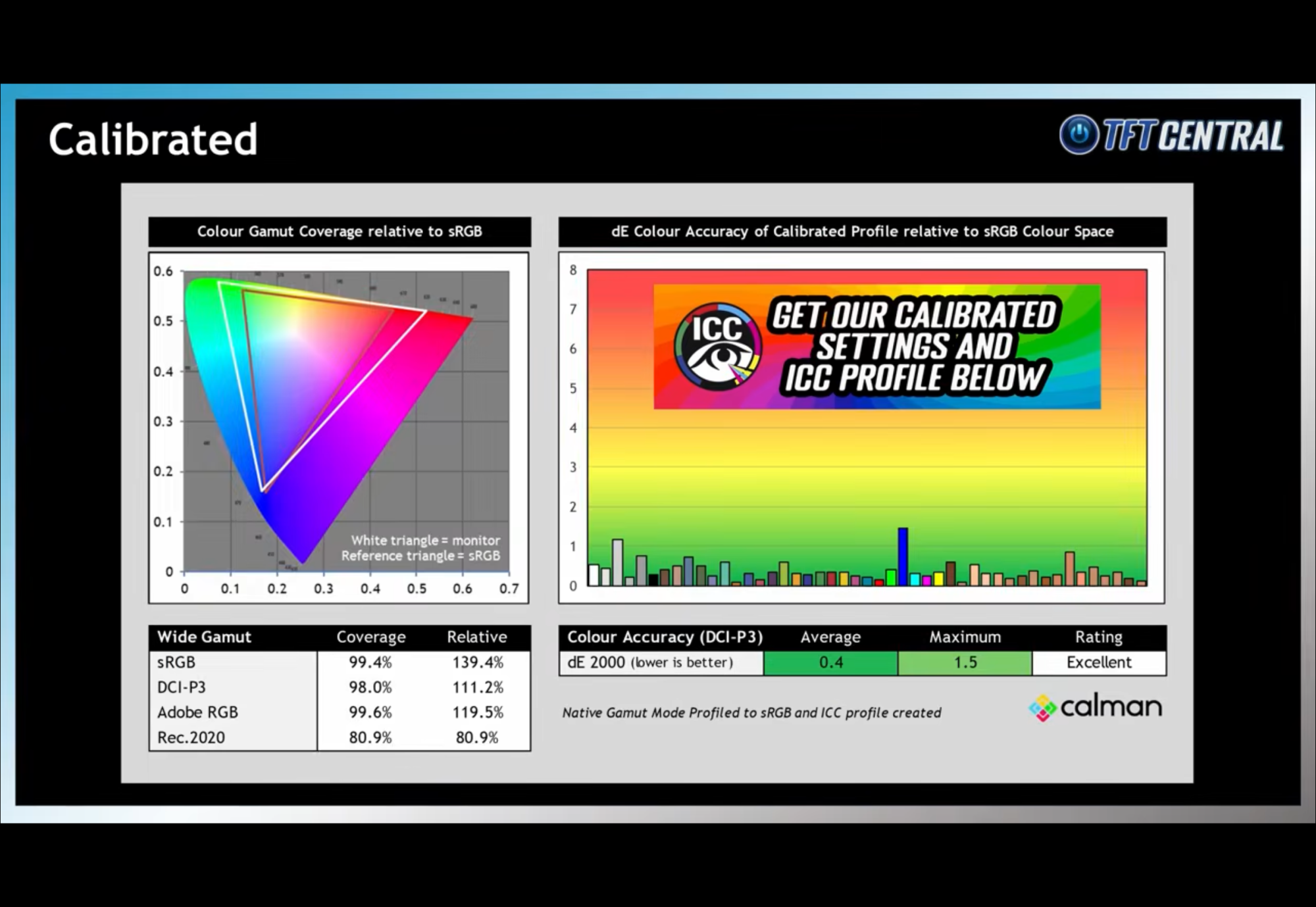 TFT Central did their own manual calibration for sRGB, and then colour accuracy was excellent across the board for all measurements. If you're going to use DCI-P3 which is the default on Macs, then the same would apply there too. They didn't do a DCI-P3 custom calibration in the review, but that's probably because they're on Windows which uses sRGB by default.