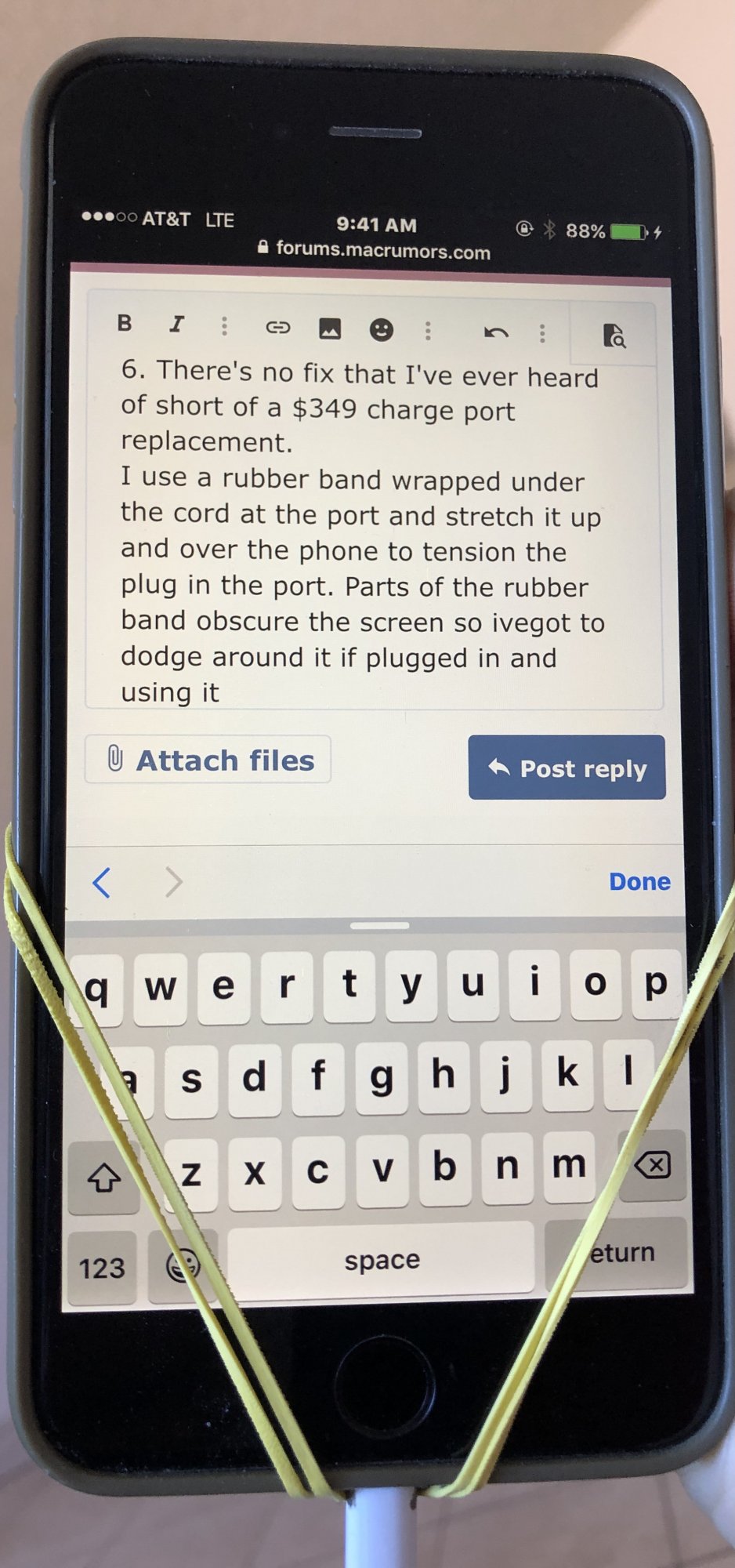 I use a rubber band wrapped under the cord at the port and stretch it up and over the phone to tension the plug in the port. Parts of the rubber band obscure the screen so ivegot to dodge around it if plugged in and using it
