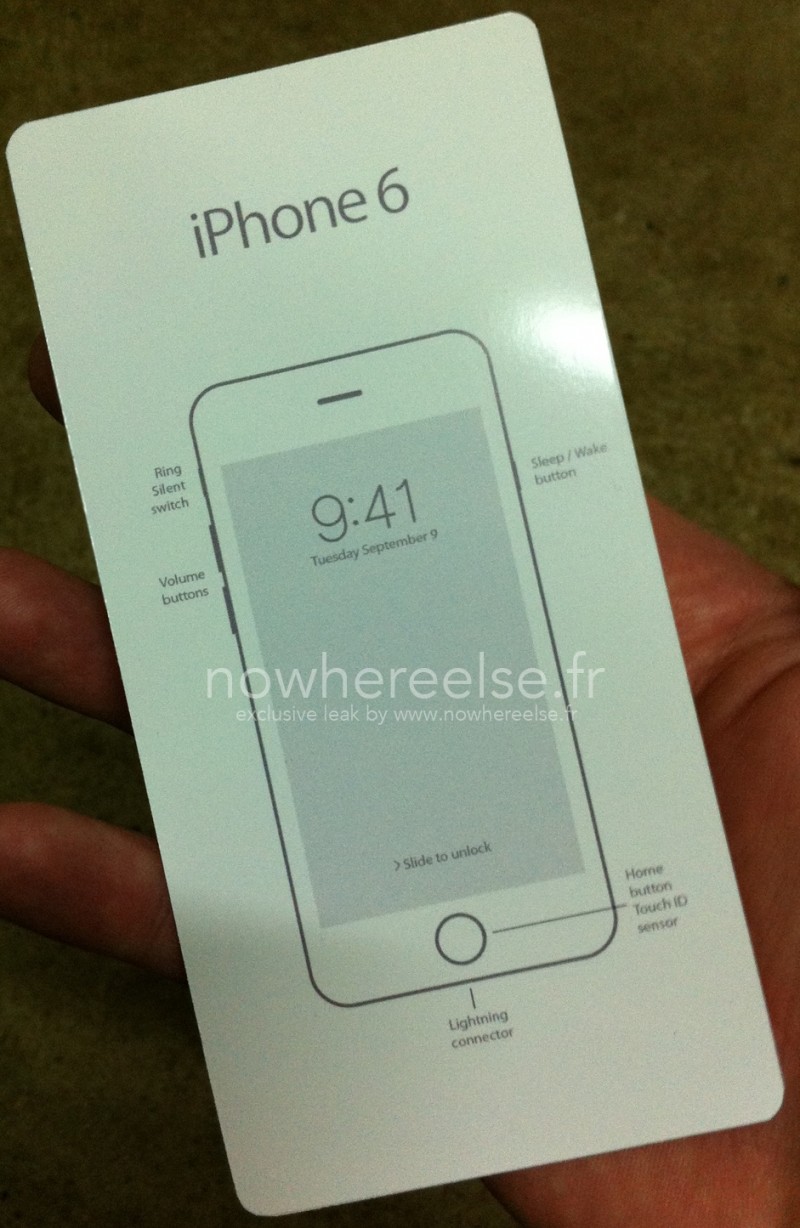 Additionally, the design of the card also lacks slashes between the Ring/Silent switch and Home Button/Touch ID sensor, and the font of the time is not quite in line with Apple's style. Nowhereelse.Fr claims that Apple has opted for a more simple insert design that does not show the actual device to explain its difference from the iPhone 5s insert, but it is unclear whether that is factual. Even when poised as a possible rough draft for a finished quick start guide, the glaring errors on the card continue suggest that it is indeed a fake and not representative of the actual insert card that will be included with the finished iPhone 6.