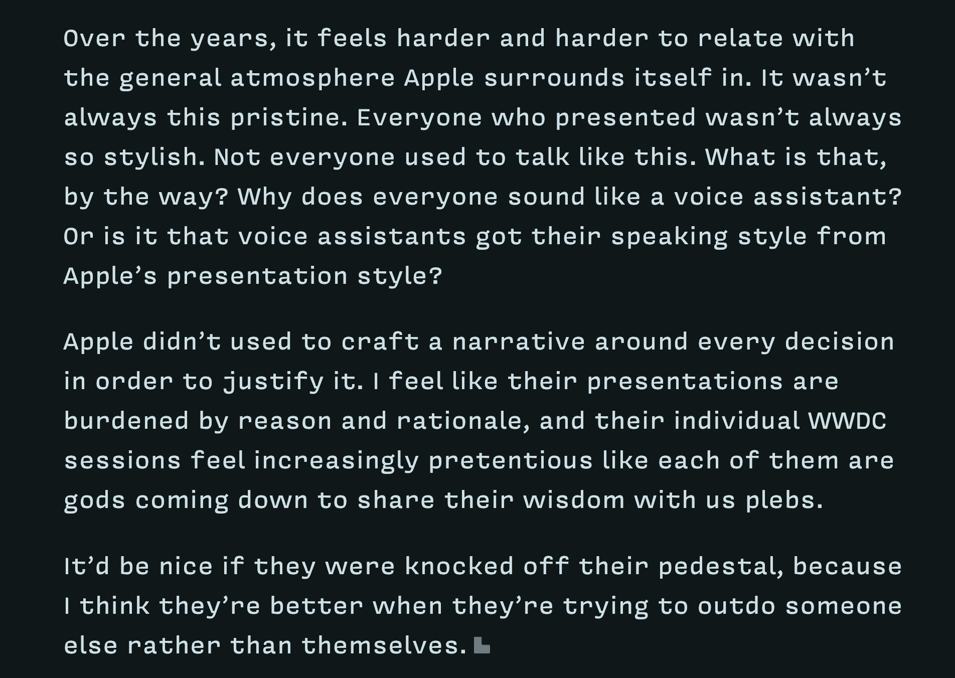 I can appreciate what they’re trying to do in continuing to push styles and design, but I think they’re trying to take too big of a swing all at once. If this is a new direction, let’s focus on icons and prominent action buttons first (like the arrow button to send an email in Mail). But trying to rearchitect large swaths, like “sidebars are now these floating platters” and all this added excess of blurring and shadowing is just too much at once without much regard to the real impact of these changes at scale, let alone any real perceived improved value for making them in the first place.