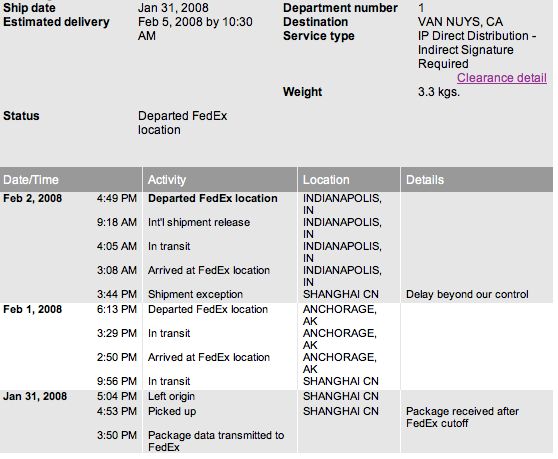 So I just called Fedex about my shipment to see what was up and they say its in Memphis already and passed customs, etc. The tracking page shows "Departed FedEx location" in Anchorage..